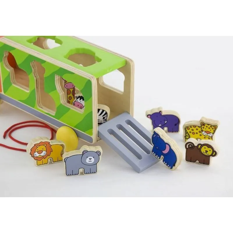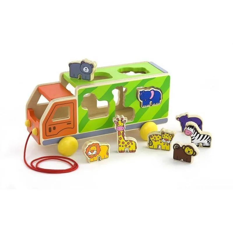 Viename žaisle traukiamas sunkvežimis ir smagių gyvūnėlių rūšiavimas.