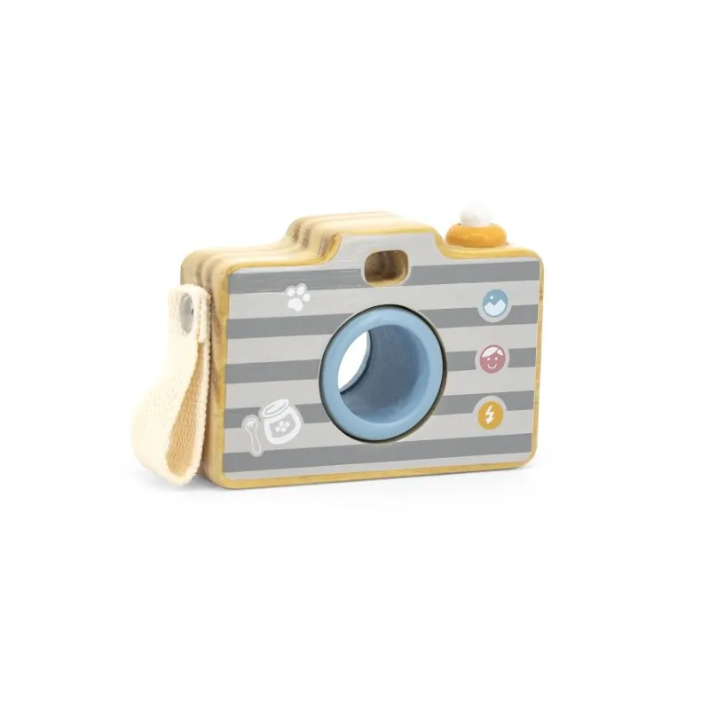 Medinė kamera su rankena šone leis vaikui fotografuoti viską ką tik užsigeis.