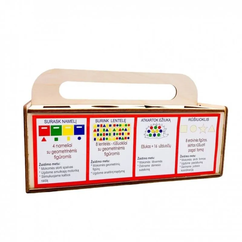 Surinkite visas vienodas figūras iš visų stalčiukų, pavyzdžiui, trikampius (turi išeiti 20 trikampių). Paprašykite vaiko: „Suraskime jiems namus“. Vaikas figūrėles pagal spalvas turi sudėlioti į tinkamus stalčiukus. Jeigu vaikas lengvai susidoroja su šia užduotimi, padarykite pertraukėlę mankštai ir tęsti su kita figūra.