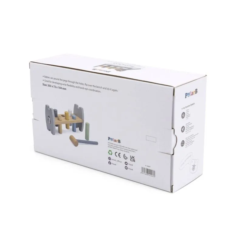 Vaiko užduotis – įkalti visus kaiščius į skylutes taip, kad jie pasislinktų į kitą rėmo pusę. Šį veiksmą galima kartoti sukant žaislą;