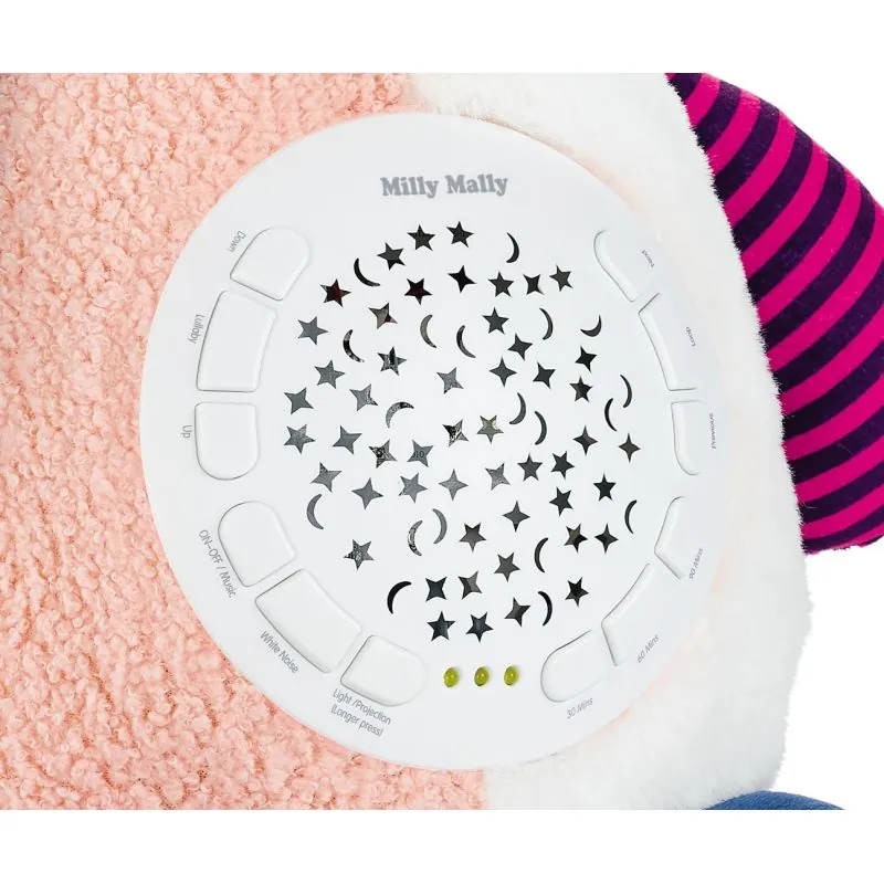 Milly Mally lapė yra nepakeičiama priemonė tėvams, kuri padės nuraminti ar užmigdyti kūdikį. Įjungę projektorių išgirsite 10 atsitiktinai parinktų lopšinės melodijų, taip pat bus rodomas naktinis dangus.