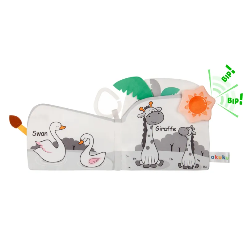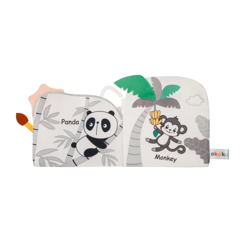 Sensoriniai elementai – Kiekviename puslapyje yra įvairių tekstūrų (pvz., minkšti lapai, pliušiniai elementai, čežėjimas) ir lytėjimo akcentai, kurie pralinksmins jūsų kūdikį ir skatins bendravimą;