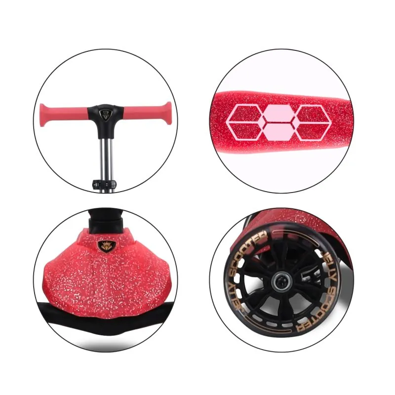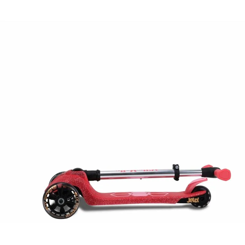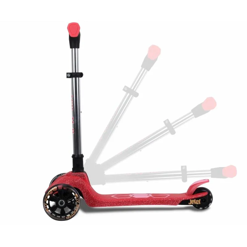 Dėl 4 pakopų rankenos reguliavimo (nuo 57 iki 72 cm), JELLY auga kartu su jūsų vaiku, prisitaiko prie jo ūgio ir poreikių. Paprasta sulankstymo sistema leidžia greitai sulankstyti paspirtuką ir pasiimti jį bet kur – be jokio vargo.