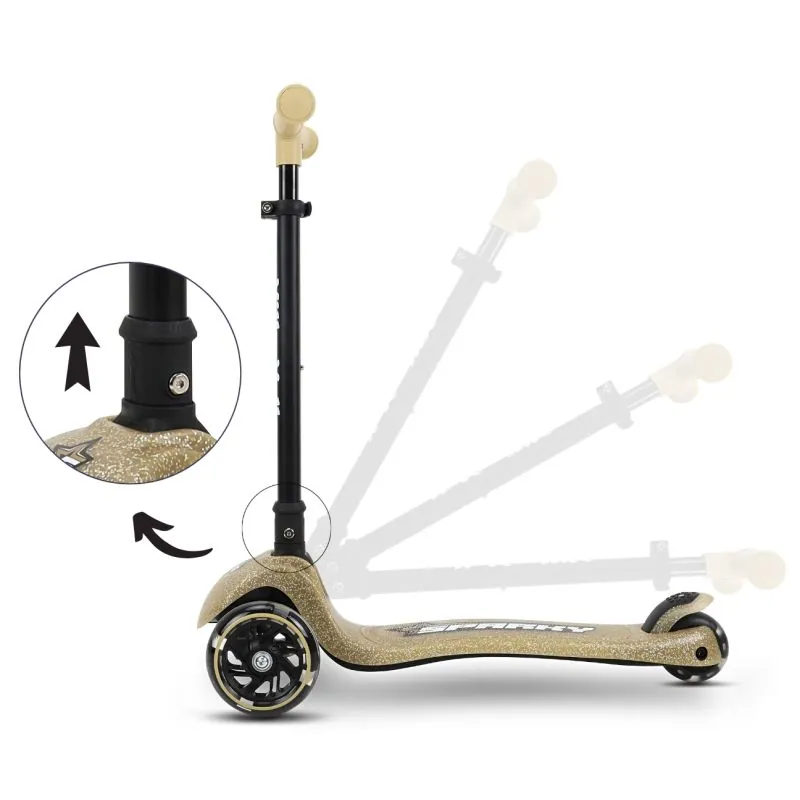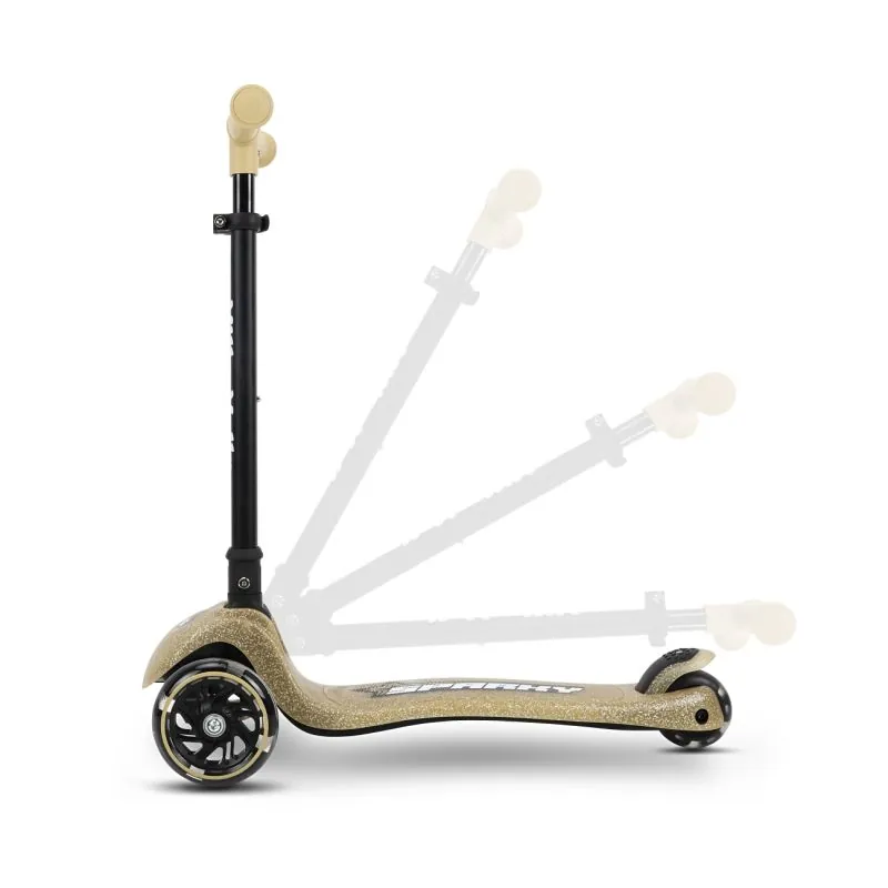 Dėl 4 pakopų rankenos reguliavimo  SPARKY paspirtukas auga kartu su jūsų vaiku, prisitaiko prie jo ūgio ir poreikių. Paprasta sulankstymo sistema leidžia greitai sulankstyti paspirtuką ir pasiimti jį bet kur – be jokio vargo.