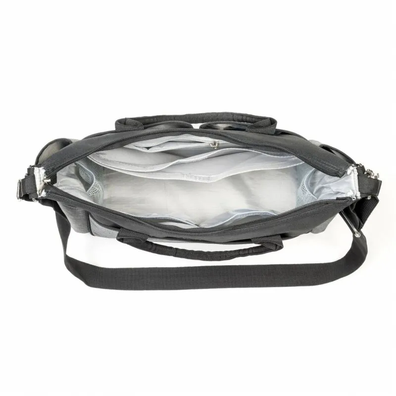 Turi ilgą ant peties kabinamą dirželį ir trumpas rankenas, rinkinyje yra vystymo kilimėlis.