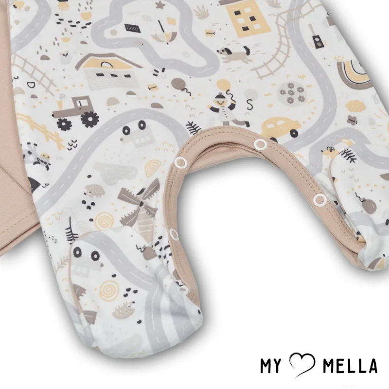 Žaismingas Miestas kolekcijos komplektas kūdikiams: šliaužtinukai ir marškinėliai.