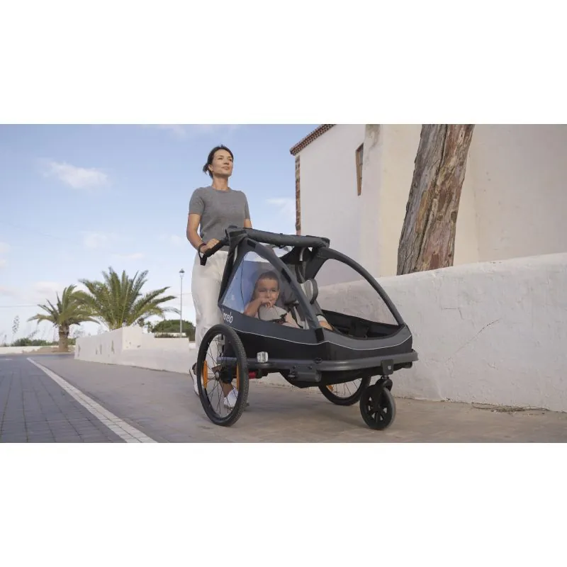Gali būti naudojamas kaip standartinis stumiamas vežimėlis arba kaip dviračio traukiamas vežimėlis.