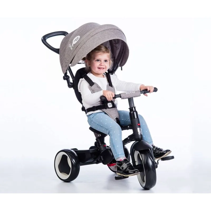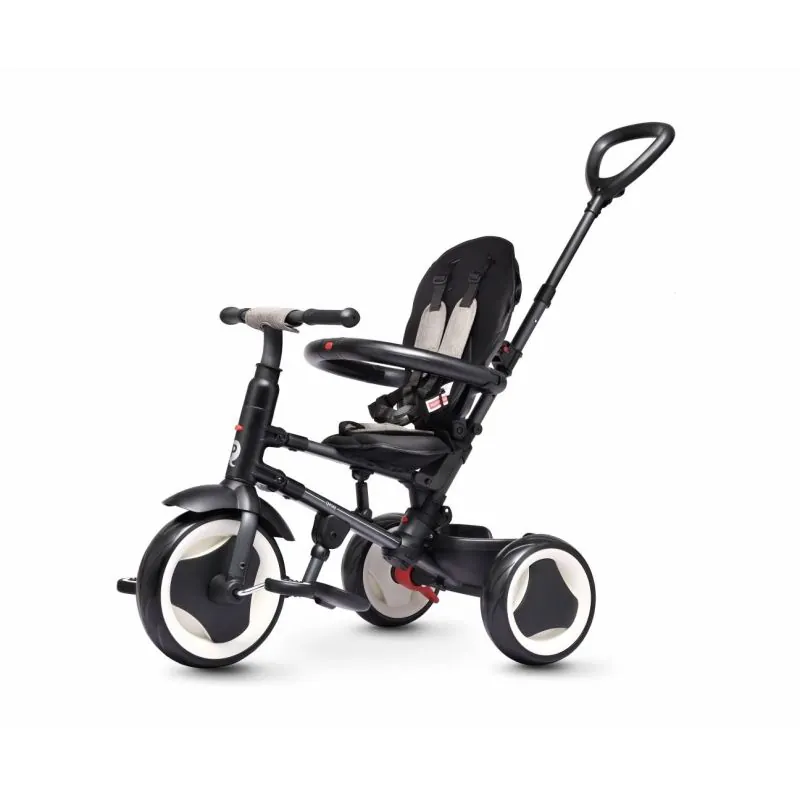 Kol vaikas išmoks savarankiškai vairuoti ir valdyti triratuką, tėveliai stumdami triratuką reguliuos važiavimo kryptį.