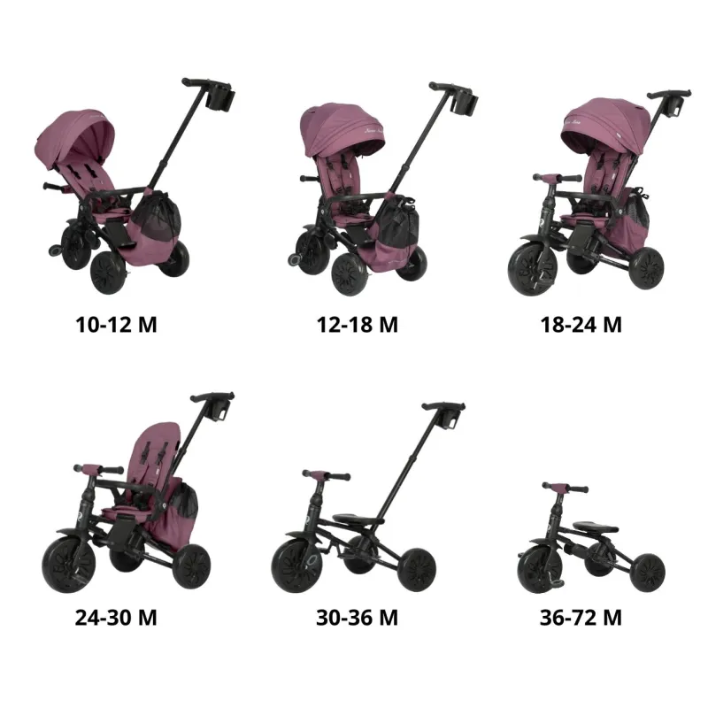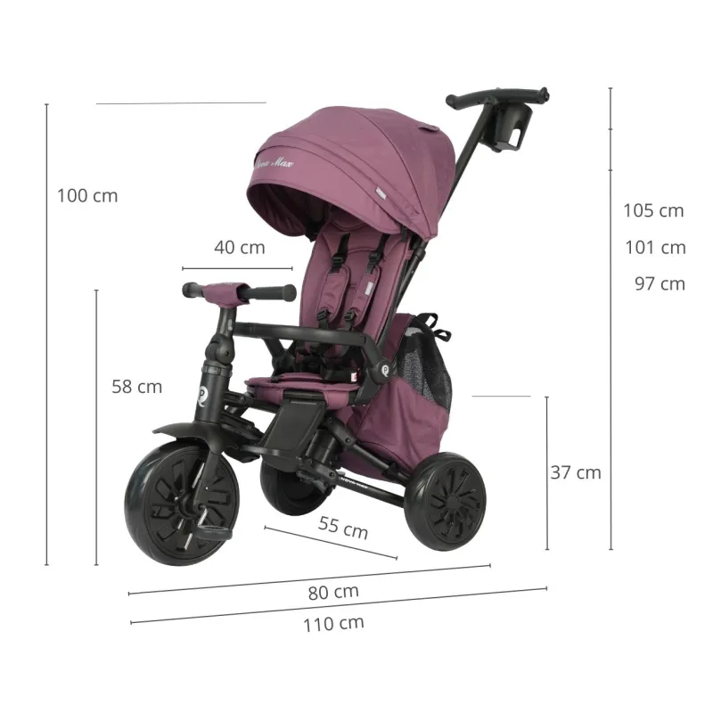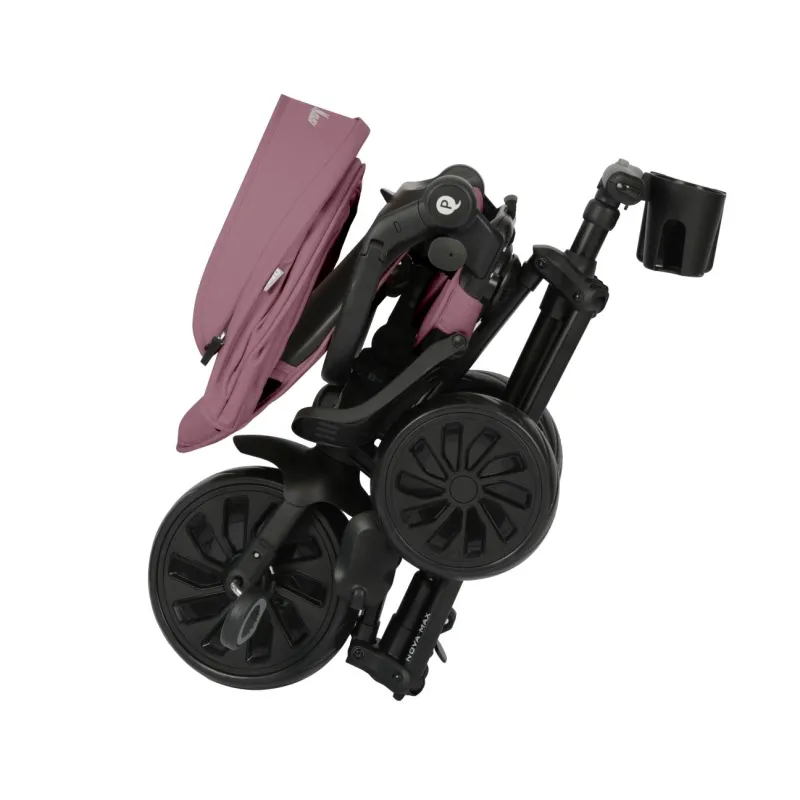 Qplay triratukas Nova Max yra stabilus ir saugus, pasižymi modernia aliuminio konstrukcija, patogia kontūruota „360“ sėdyne, leidžiančia važiuoti pirmyn arba atgal važiavimo kryptimi. Surinkimui nereikia jokių įrankių – greito sulankstymo sistema leidžia sulankstyti triratį vos keliais paprastais judesiais.