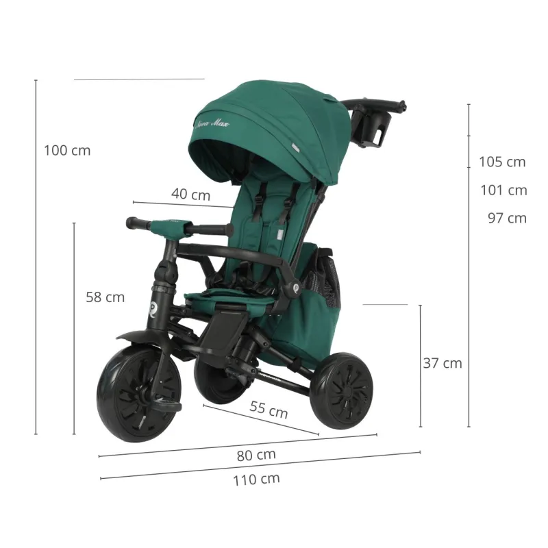 Qplay triratukas Nova Max yra stabilus ir saugus, pasižymi modernia aliuminio konstrukcija, patogia kontūruota „360“ sėdyne, leidžiančia važiuoti pirmyn arba atgal važiavimo kryptimi. Surinkimui nereikia jokių įrankių – greito sulankstymo sistema leidžia sulankstyti triratį vos keliais paprastais judesiais.