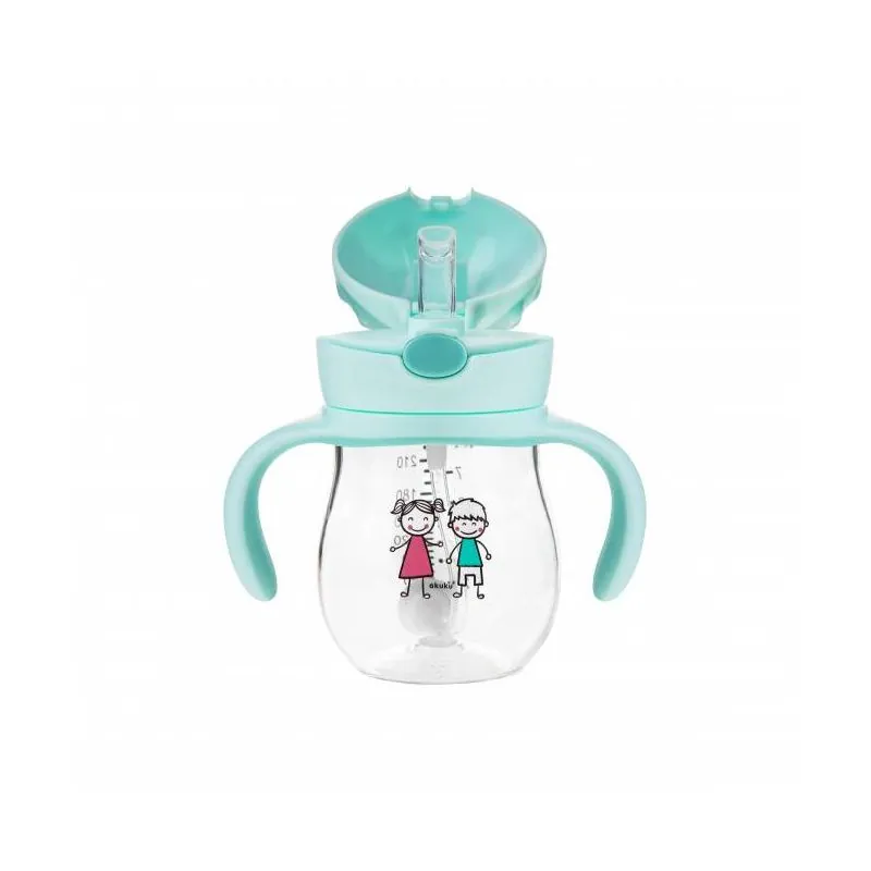 Akuku neišsiliejantis mokomasis puodelis 250 ml su svareliu ir dviem rankenėlėmis, A0033