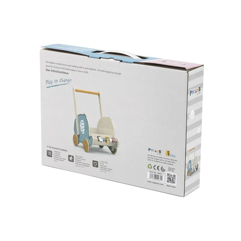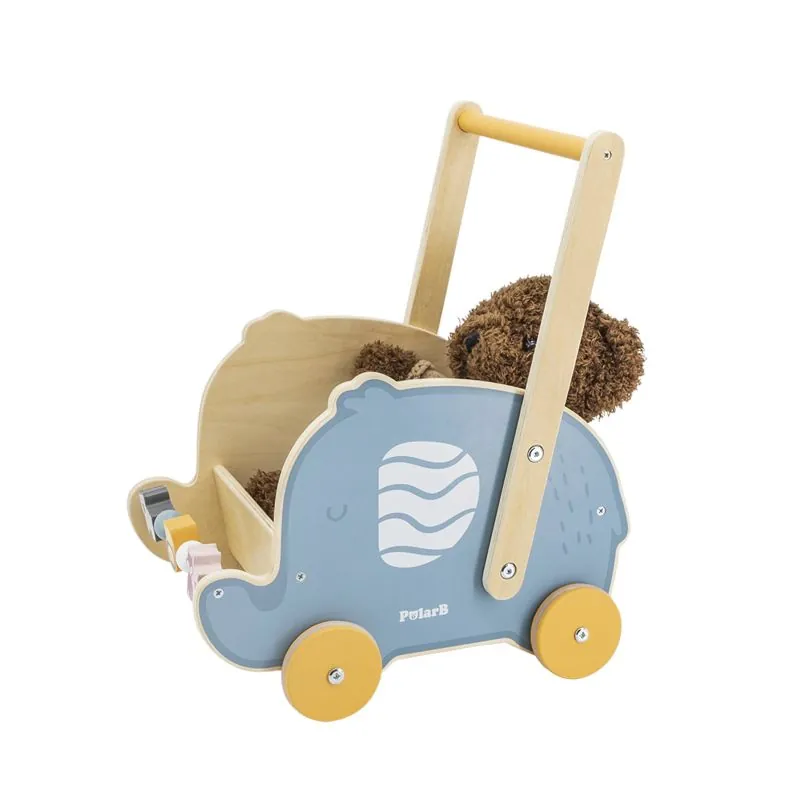 Daugiafunkcinis medinis stumdomasis vežimėlis drambliuko pavidalu.