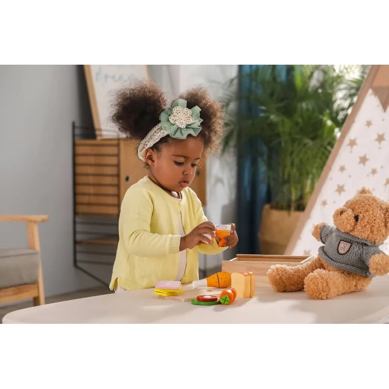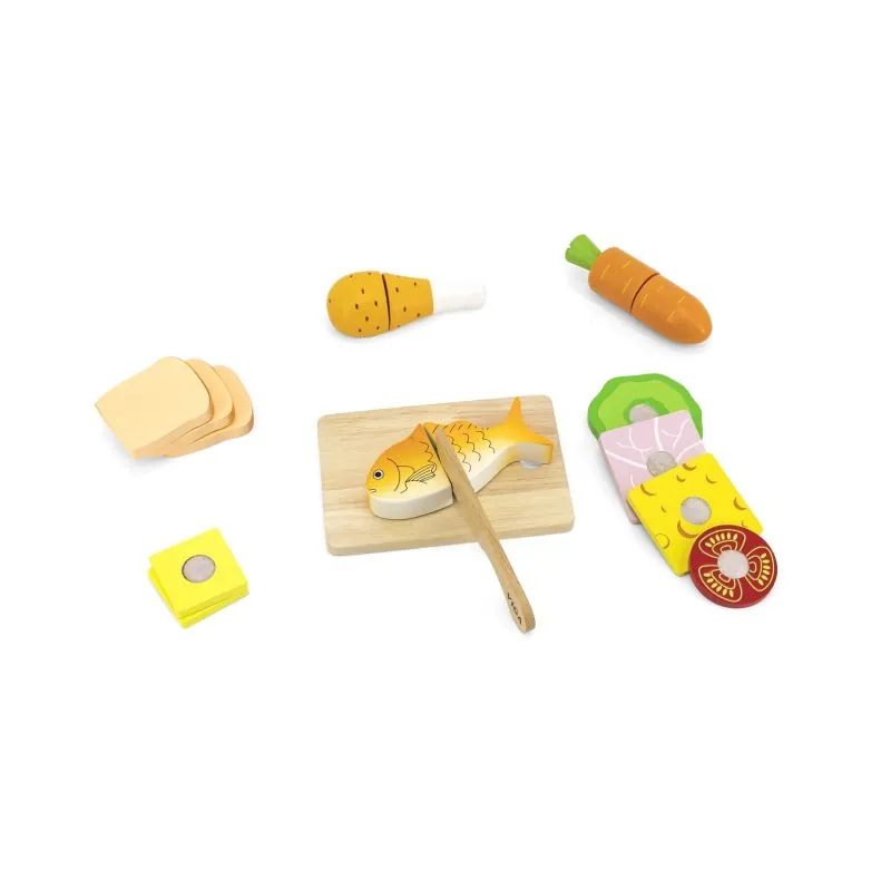 Rinkinyje yra: dėžutė, peilis, pjaustymo lenta, maisto produktų imitacijos.