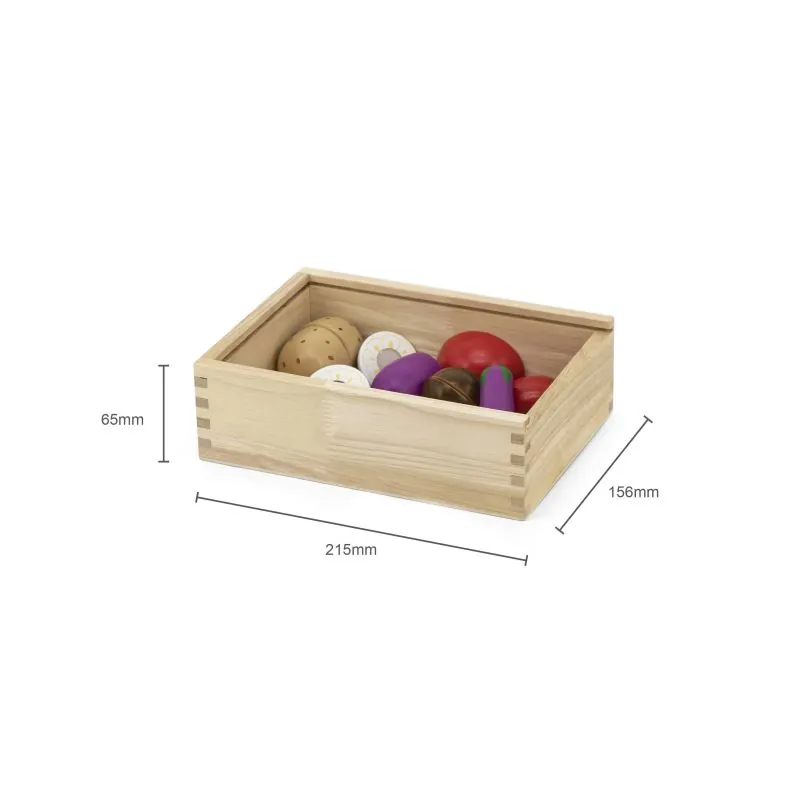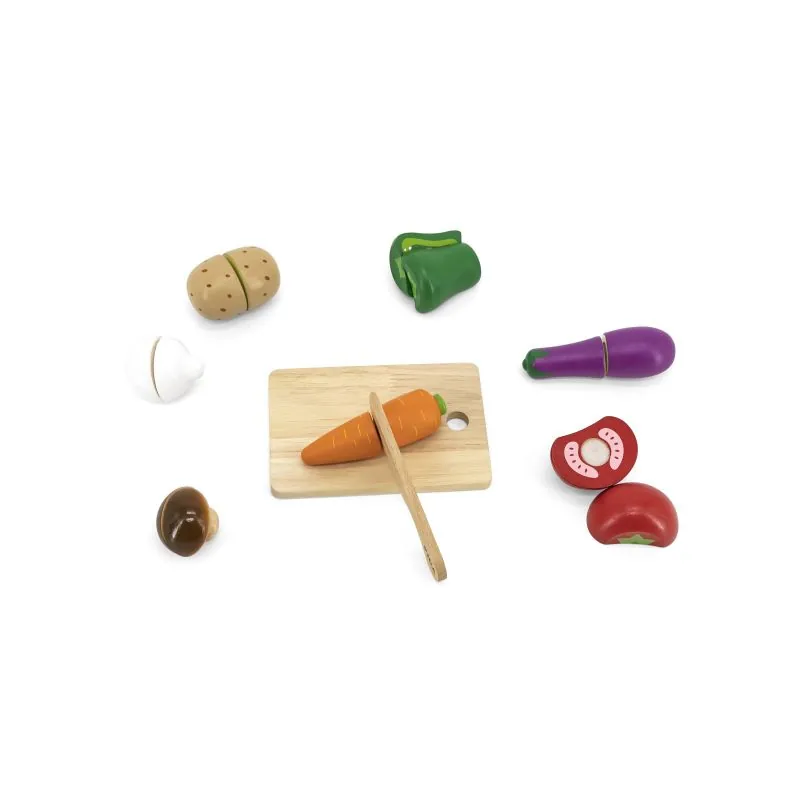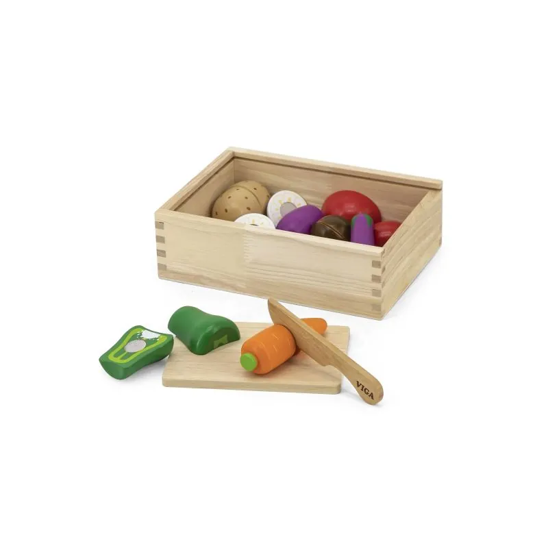 Rinkinyje yra: dėžutė, peilis, pjaustymo lenta, daržovių imitacijos.