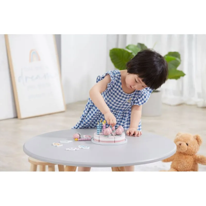 Rinkinyje yra medinė lėkštė, 6 torto gabaliukai, mentelė torto įdėjimui, 6 dekoraciniai elementai, 6 žvakutės ir mediniai skaičiai.