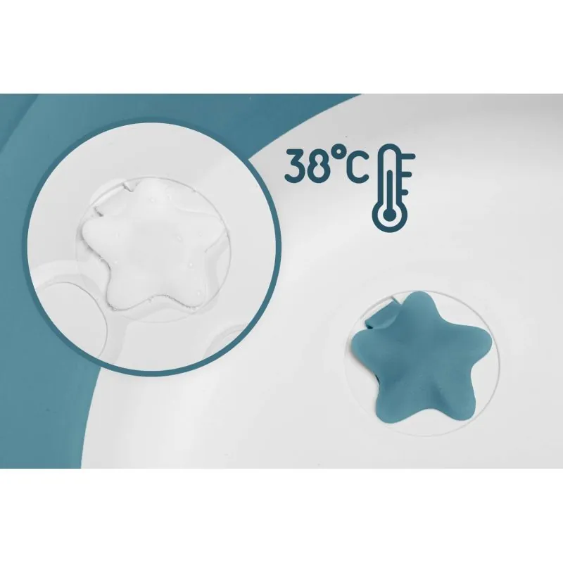 Temperatūrai pakilus iki 38 laipsnių vonelės kamštis pakeis spalvą, indikuodamas, kad kūdikiui nesaugu.