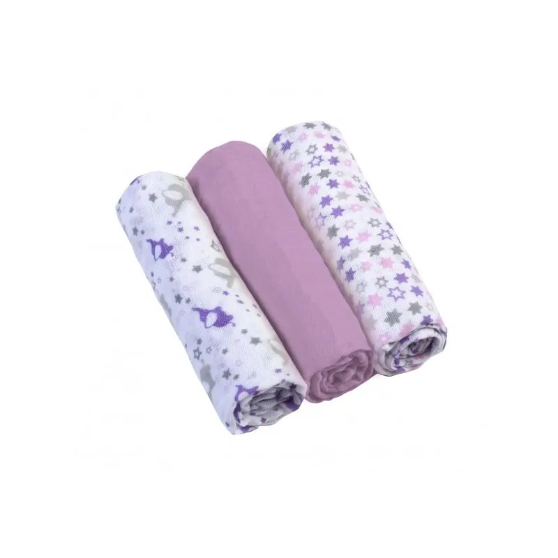 Muslinas - tai dvisluoksnė „tetra“ 100% medvilnė, audinys labai minkštas liečiant ir praleidžia orą, todėl vystyklus galima naudoti nuo pat pirmųjų gyvenimo dienų - kaip gobtuvą, apklotėlį, vystymo paklotą, paklodę ar rankšluostį.