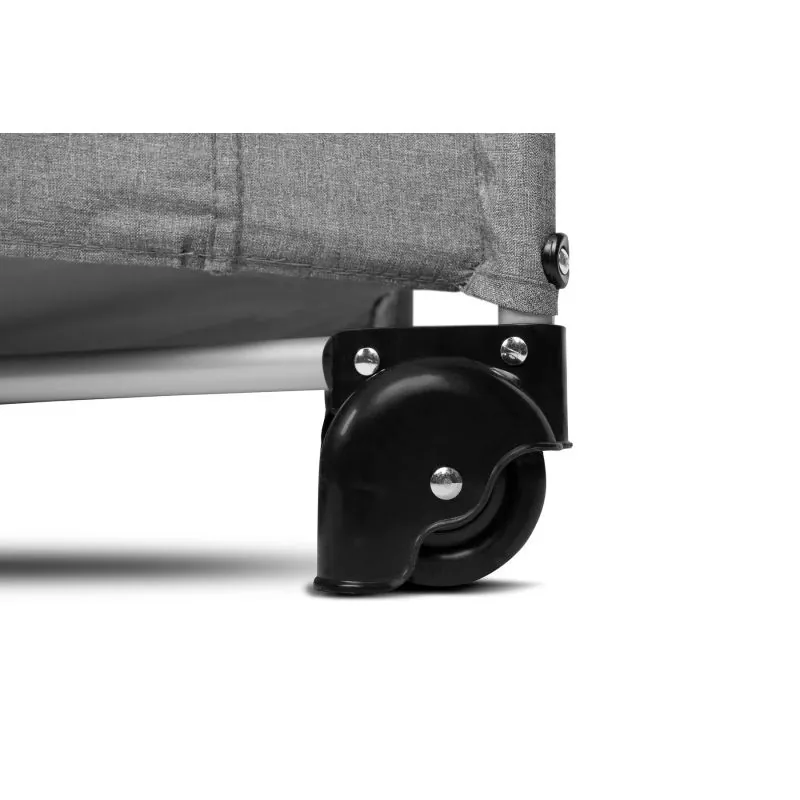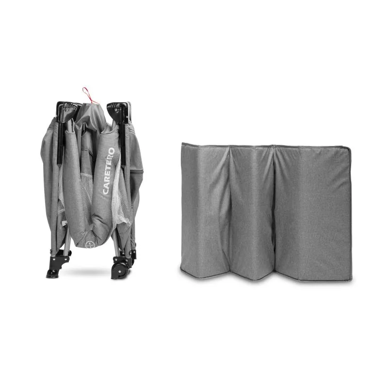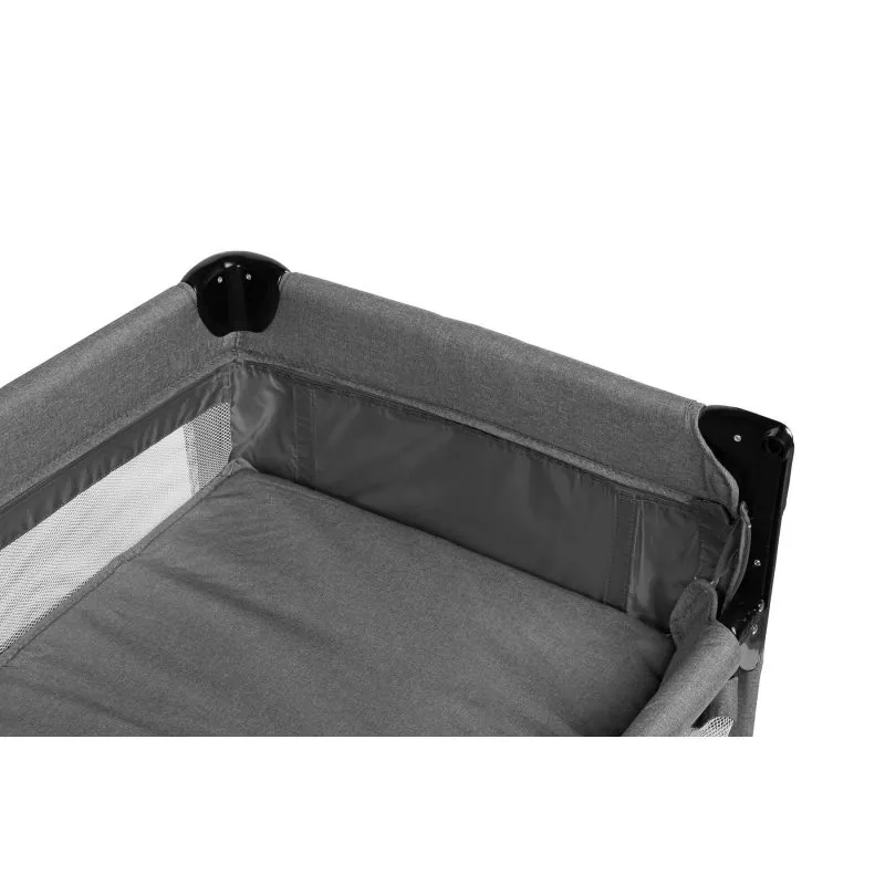 Lieliski piemērots lietošanai mājās vai ceļojumā;Divu līmeņu pamatne (mazulis guļ augstāk, vēlāk lielāks bērns guļ zemākā līmenī);Otrais līmenis piemērots zīdaiņiem līdz 9 kg vai līdz brīdim, kad mazulis sāk sēdēt;Pamatne ar polsterējumu;Nolaižama mala, lai manēžu varētu piebīdīt pie gultas;Vieglāk izņemt un ielikt mazuli gultiņā, jo mala ir nolaižama;Durvis ar rāvējslēdzēju, bērns var pats iekāpt un izkāpt no gultiņas;Tīkliņveida malas nodrošina labu gaisa cirkulāciju;Lieli riteņi ar bremzēm;Ērta soma ar rokturiem, piemērota ceļošanai vai uzglabāšanai;Salocīts aizņem maz vietas un ir kompakts;Izliekto ārējo izmēri: 126 x 65 x 74 cm;Salocīto izmēri: 21 x 21 x 74 cm;Atbilst Eiropas standartam: EN 716:2017-07.