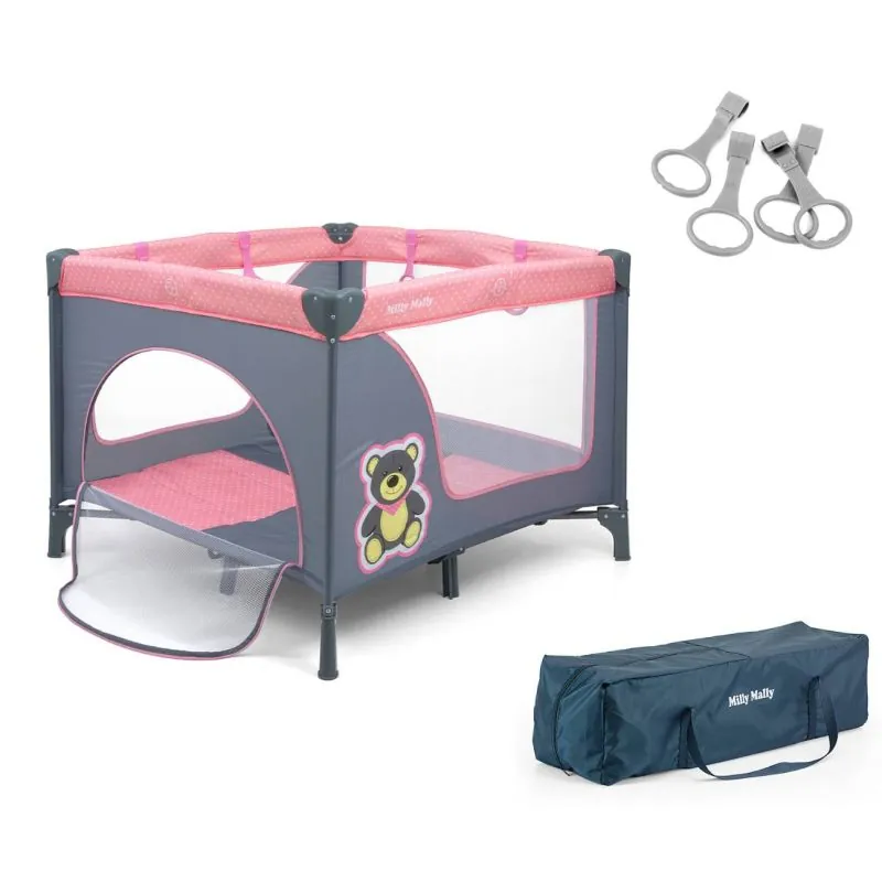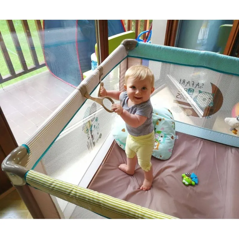 Atveras viena puse, lai bērns varētu viegli pats izkāpt un iekāpt.Ātra un vienkārša salocīšana.Caurspīdīgs tīkls ļauj bērnam viegli novērot apkārtni.Polsterējums viegli tīrāms.Krāsains mīksts matracis.Pārnēsāšanas soma.Tīkls pret odiem.Gredzeni.Izmērs: 100 x 100 cm.Salocīts izmērs 22x21x95.Svars 10 kg.