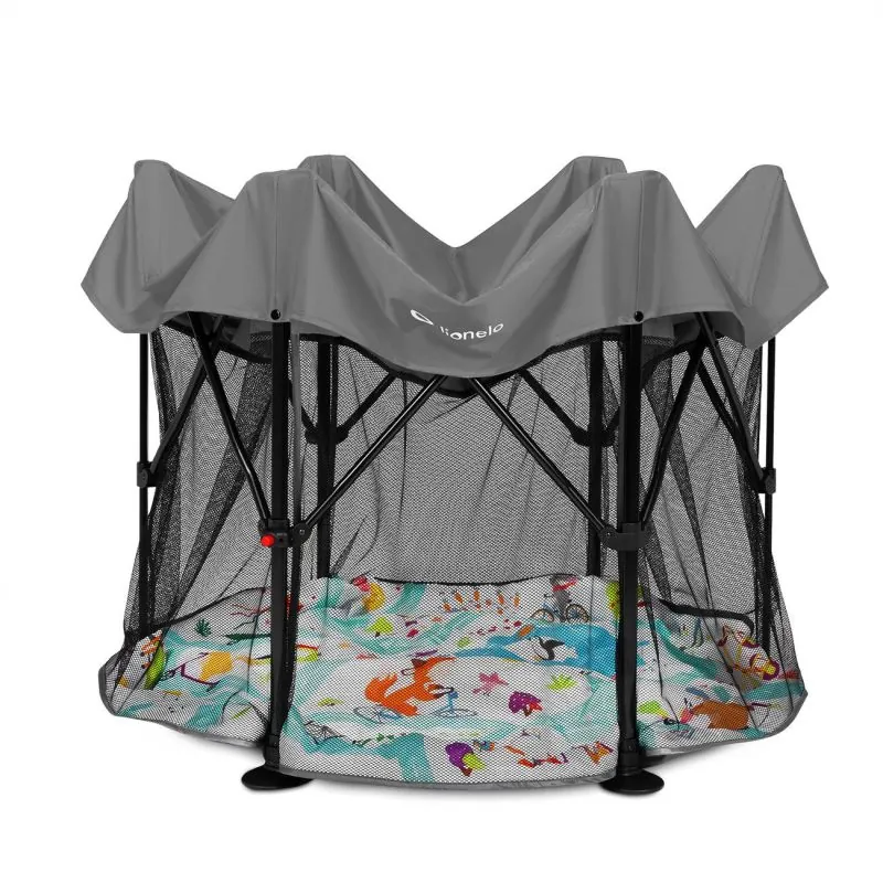 Ātra un droša salocīšanas sistēma, kā arī pārnēsāšanas soma lieliski piemērota pat ceļojumu apstākļos. Pateicoties mīkstajai pamatnei un vieglajiem, izturīgajiem materiāliem, manēža ir lieliska vieta bērniem līdz 2 gadu vecumam spēlēties.Liela spēļu telpaSešstūra formas manēža – interesanta un funkcionāla telpa spēlēm un bērnu aksesuāru glabāšanai.Intuitīvs manēžas salocīšanas mehānisms ir vienkārši lietojams un ļauj to salocīt līdz mazam izmēram.Plašs tīkls.Manēžas sienas izgatavotas no caurspīdīga un elpojoša materiāla, kas nodrošina atbilstošu gaisa cirkulāciju.Komplektā ietilpst plaša transportēšanas soma, tāpēc izstrādājumu ir ērti uzglabāt un pārnēsāt.Manēža Roel ir mīksta un elastīga pamatne, kas pozitīvi ietekmē pirmos soļus speroša mazuļa stājas stabilizāciju. Tā ir pildīta ar augstas kvalitātes putuplastu. Manēžas grīdas ārpuse pārklāta ar nodilumizturīgu un netīrumiem izturīgu audumu. Izstrādājumam ir lieliska siltumizolācija, tāpēc to var viegli izmantot arī ārpus mājas.Manēžas augšējā daļa, kurā ir metāla elementu savienojumi, kas ļauj salocīt un izklāt, ir nostiprināta ar platu, estētiska materiāla plāksni, kas palielina konstrukcijas stabilitāti un aizsargā no iespējamām traumām spēlējoties. Noņemamos polsterējumus var mazgāt mašīnā.Stabila tērauda manēžas konstrukcija ir aprīkota ar aizsargierīci, kas aizsargā izstrādājumu no nejaušas salocīšanas. Kājas ar neslīdošiem spilventiņiem arī rūpējas par pareizu Roel modeļa pozīciju. Manēža veiksmīgi izturējusi daudzpakāpju iekšējo kontroli un testus neatkarīgā SGS sertifikācijas laboratorijā. Tā atbilst Eiropas drošības standarta EN 12227 prasībām.