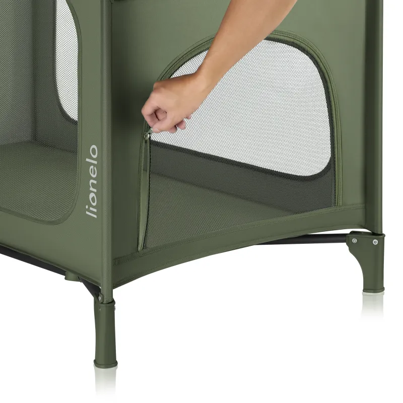Lionelo Jasmin Easy Fold divstāvu manēža, zaļā olīvu krāsa