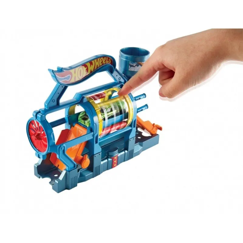 Uzbrauc uz rampas;Automašīnu paceļ uz platformas;Pagriežams ūdens rezervuārs („rinse“) – simbolizē automašīnas „mazgāšanu“;Automašīna pārbrauc pāri veltņiem (rollers) – sākas „mazgāšanas darbība“;Pagriežot „turbo“ daļas, simbolizē žāvēšanu;Izbrauc no rampas un vari braukt tālāk;Komplekts ir saderīgs ar citiem Hot Wheels trases/spēļu komplektu moduļiem – var pievienot papildu trases;Nav nepieciešamas baterijas – spēles mehānika ir manuāla (spēlētājs pats manuāli visu aktivizē).