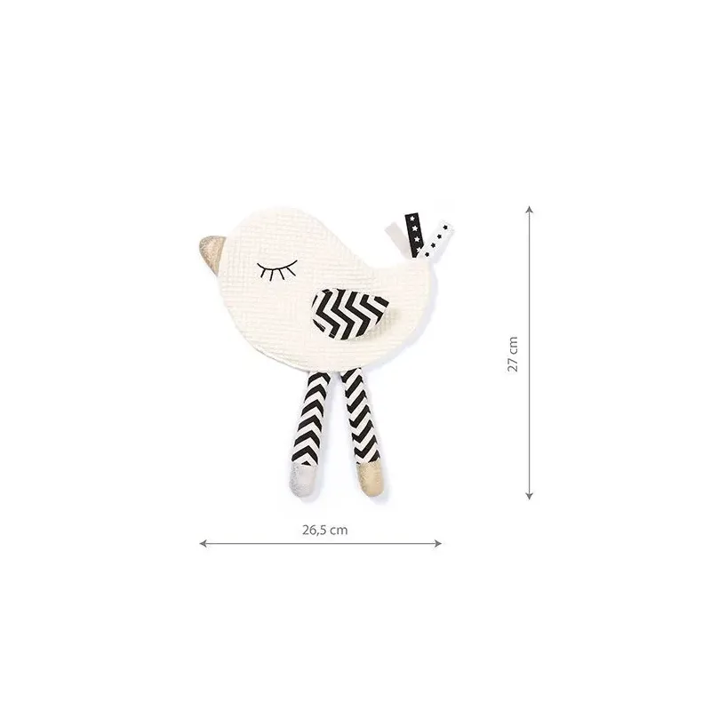 Čaukstošs miega draugs veicina bērna sajūtu attīstību spēlējoties;Izgatavots no mīkstas un maigas kokvilnas;Atbalsta bērna kognitīvo spēju attīstību;Dažādi elementi un tekstūras veicina smalko motoriku attīstību;Čaukstēšana attīsta dzirdes sajūtas;Kontrastējošas krāsas veicina redzi;Piemērots bērniem no dzimšanas;Izmēri: 26,5 x 27 cm.