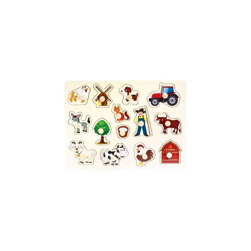 Medinė lavinamoji dėlionė su rankenėlėmis - puiki priemonė supažindinti mažyli su fermos gyventojais, pastatais ir transportu.
