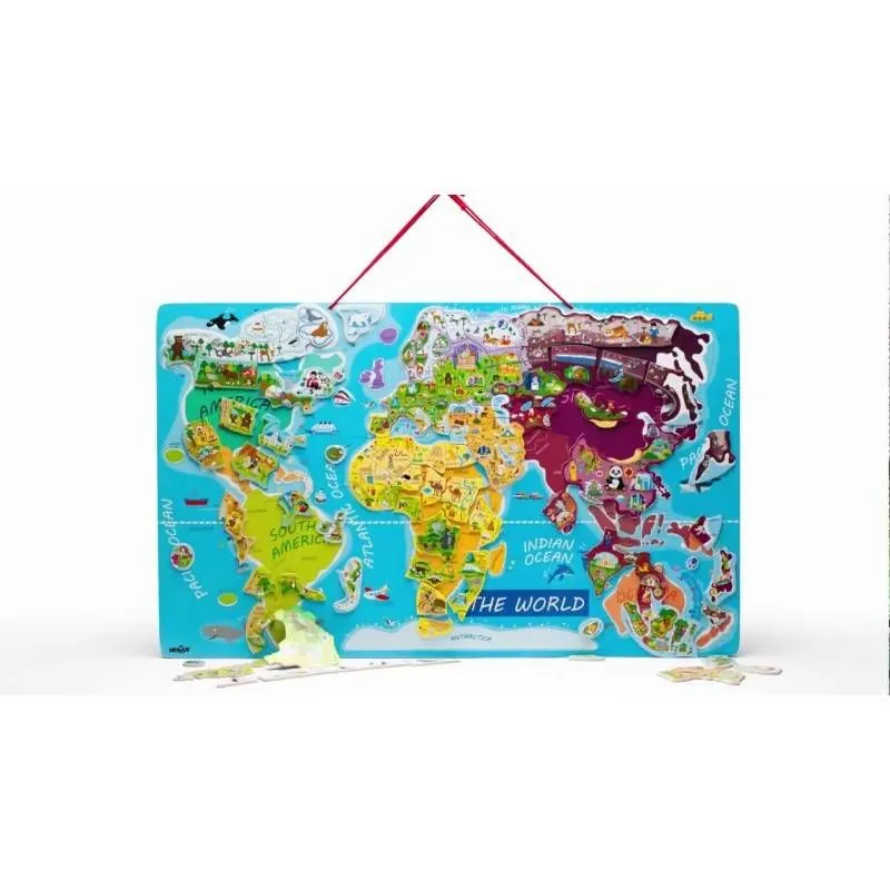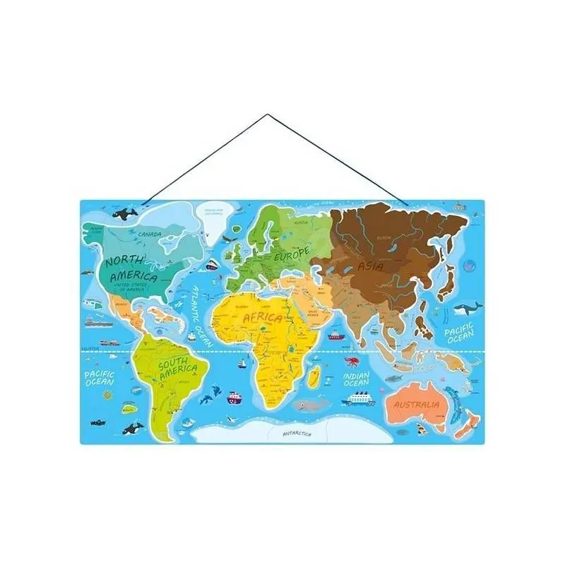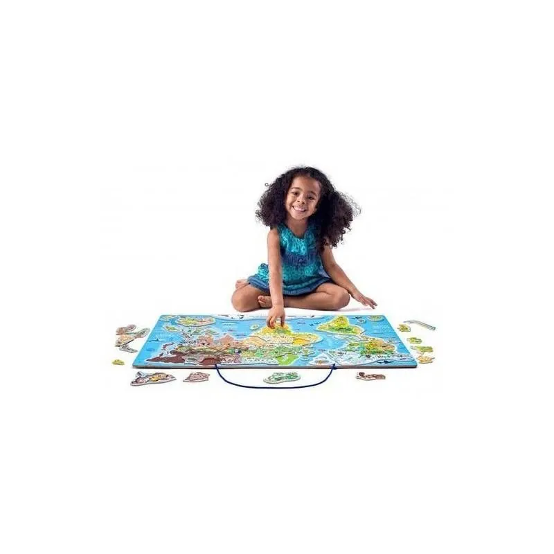 Velkami magnētiņi, izvelkot attēlu, bērnam ne tikai jāatrod tā atrašanās vieta, bet arī jāapraksta, jāpasaka, kurā valstī tas ir. Iespēja paplašināt spēli pēc vecāku vai skolotāju iztēles. Komplektā ir 91 detaļa.