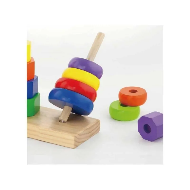 Gredzeni, astoņstūri un taisnstūri var tikt uzmaukti uz trim koka stieņiem. Sakrauti viens uz otra vai izkārtoti, lai varētu salīdzināt formas, izmērus un krāsas. Formu saskaņošana un dažādu modeļu veidošana. Šī trīskārši sakraujamā rotaļlieta palīdz mācīt šķirot, atpazīt krāsas un formas.Palīdz bērniem attīstīt smalko motoriku. Veicina roku un acu koordināciju un roku veiklību.