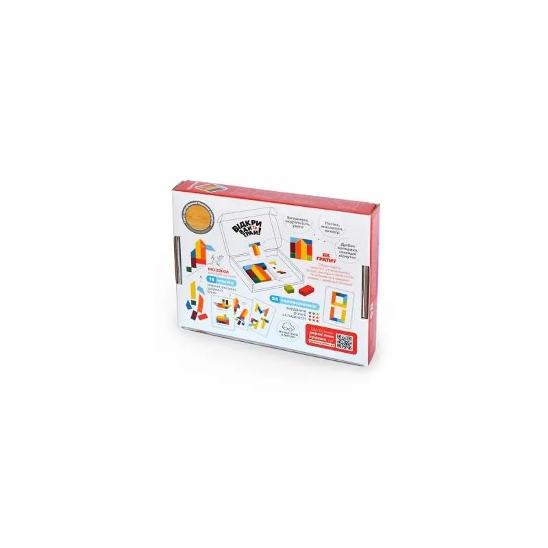 8 krāsainas koka formas;10 divpusējas krāsainas kartītes ar 24 dažādas sarežģītības loģiskajiem uzdevumiem;18 mozaīkas-zīmējumus.