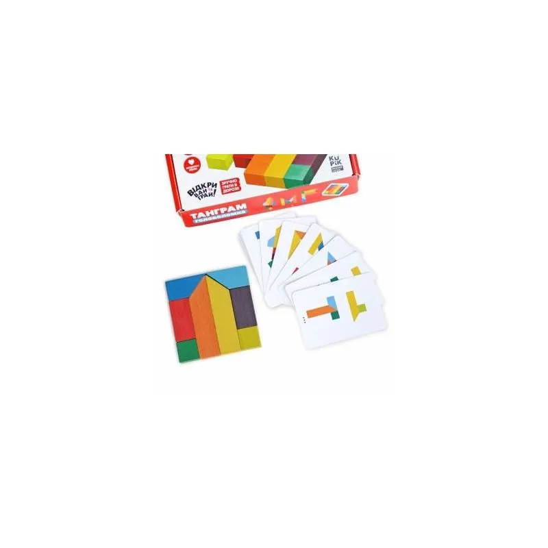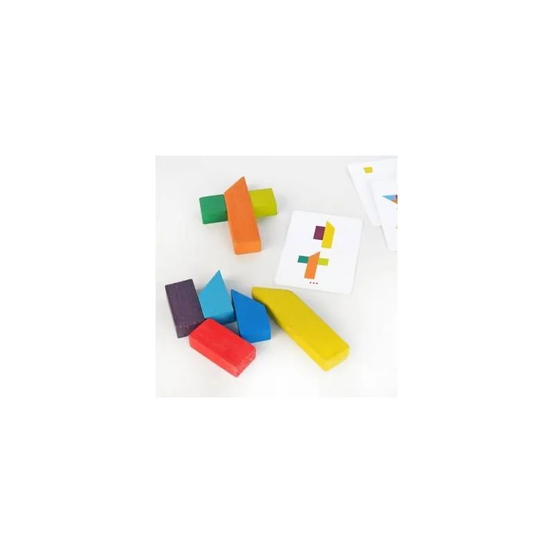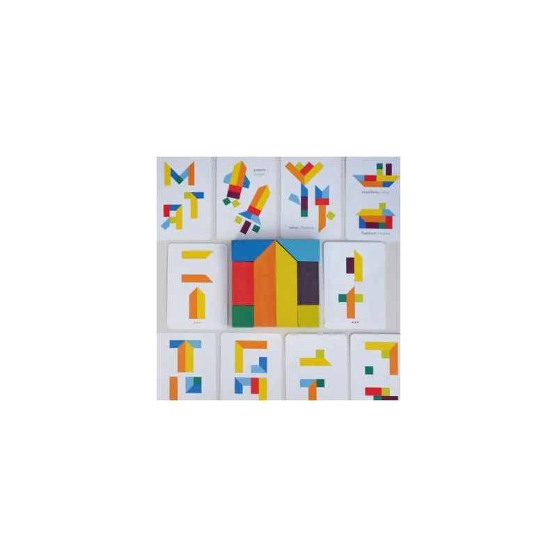 8 krāsainas koka formas;10 divpusējas krāsainas kartītes ar 24 dažādas sarežģītības loģiskajiem uzdevumiem;18 mozaīkas-zīmējumus.