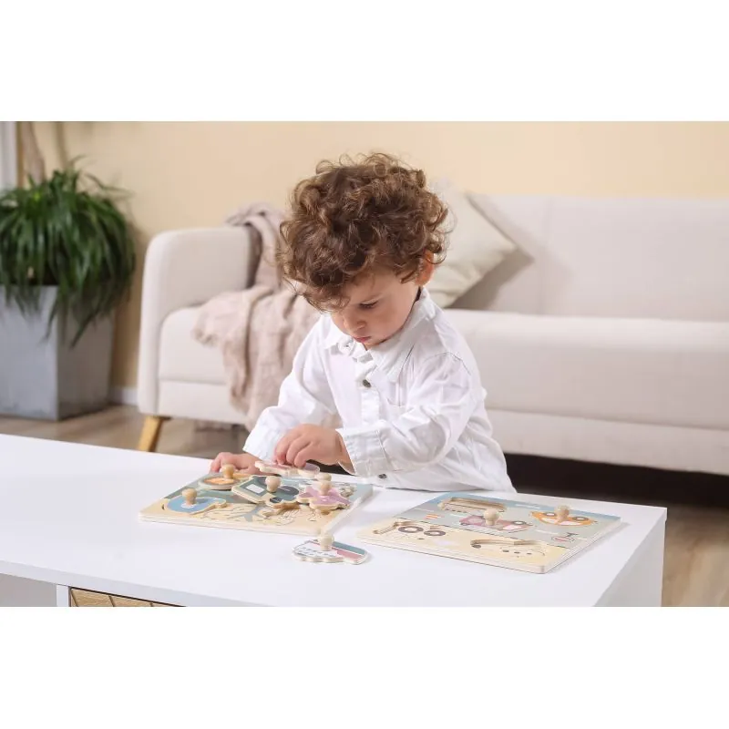 Katra detaļa ir viegli izņemama un ievietojama pielāgotajā vietā. Ir turētāji - rokturi.Palīdz attīstīt motoriskās prasmes.Māca atpazīt un saprast formas, krāsas.Izgatavots no dabīgiem materiāliem. Pārklāts ar drošām krāsām.Ieteicams bērniem no 18 mēnešiem.