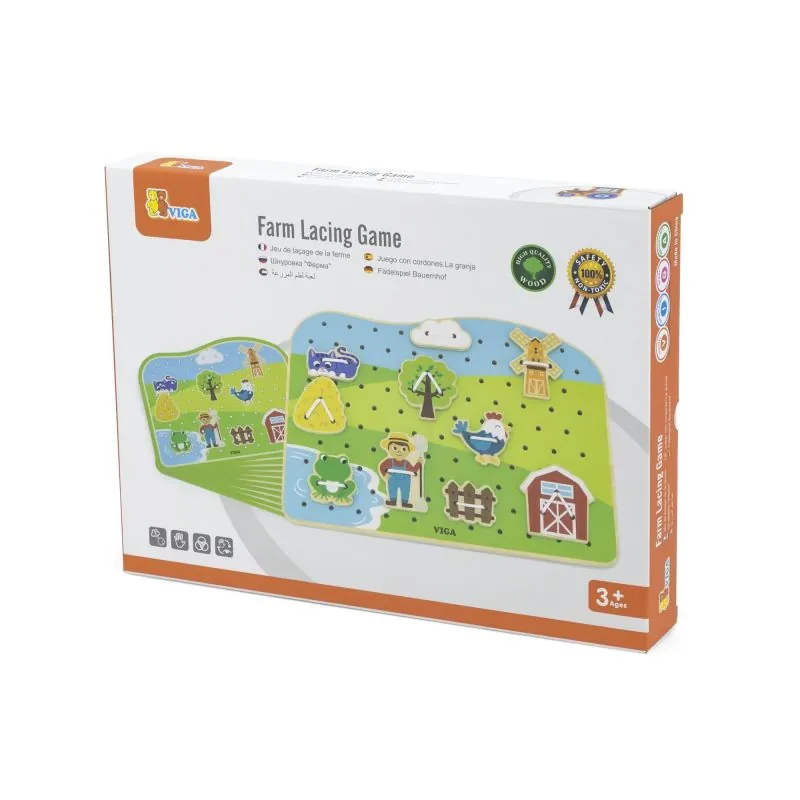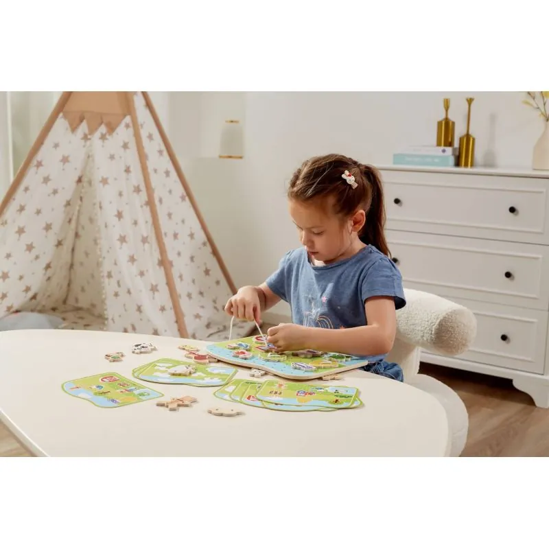 Attīsta smalko motoriku un māca pareizi turēt pildspalvu vai krītiņus. Tas arī atbalsta koncentrēšanās attīstību un māca pacietību.Komplektā ietilpst: govs, divi baloži, traktors, kūts, dzeltens un sarkans kurpju šņore.Visi priekšmeti ir izgatavoti no dižskābarža koka un krāsoti ar netoksiskām krāsām spilgtās krāsās, kas piesaistīs uzmanību un veicinās spēlēšanu.Krāsas, ar kurām tiek krāsotas rotaļlietas, būtu netoksiskas un atbilstu drošības standartiem (EN71 un ASTM).Rotaļlieta ir paredzēta bērniem no 3 gadu vecuma.Izstrādājuma izmēri:Garums: 290 mm x A: 220 mm x P: 20 mm
