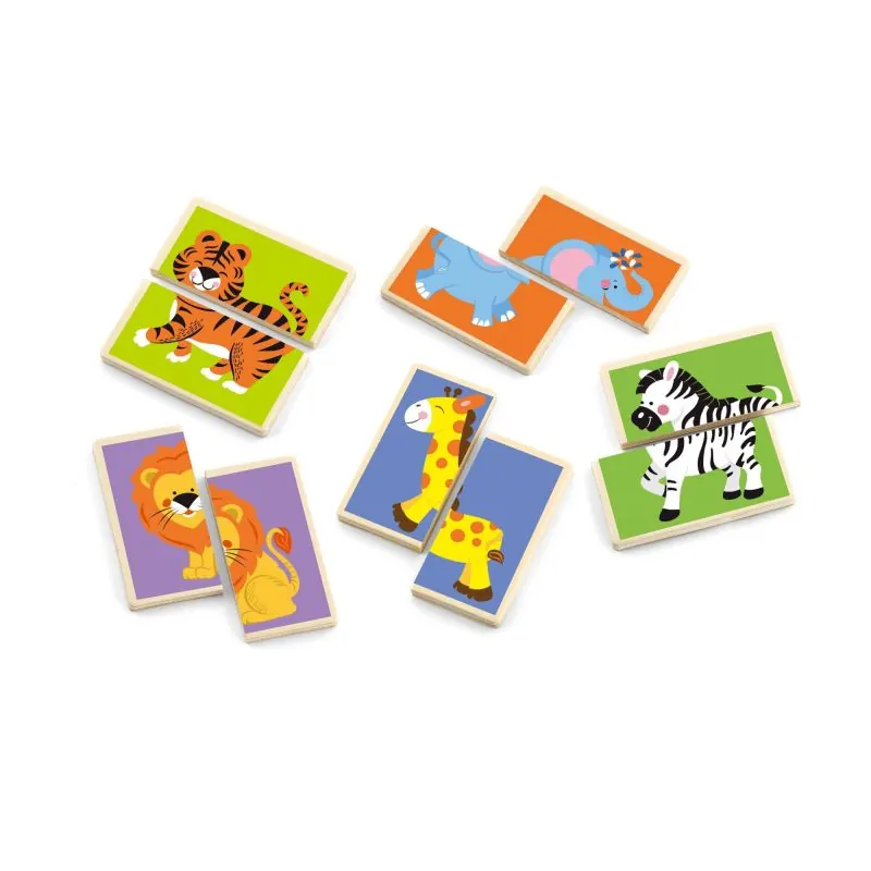 Jautri atrast un saskaņot otru pusi no 9 sadalītiem savvaļas dzīvnieku attēliem (lauva, tīģeris, zilonis, zebrs, žirafe, pērtiķis, nīlzirgs, lācis un panda).Katram dzīvniekam ir divas kartītes: viena ir sadalīta vertikāli, bet otra - horizontāli.Komplektā ir 36 elementi.Rotaļlieta paredzēta bērniem no 3 gadu vecuma.Visi priekšmeti ir izgatavoti no lakota koka un krāsoti ar netoksiskām krāsām spilgtās krāsās.Krāsas, ar kurām tiek krāsotas rotaļlietas, ir netoksiskas un atbilst drošības standartiem (EN71 un ASTM).Viena puzles izmērs:60 mm x 30 mm x 5 mm