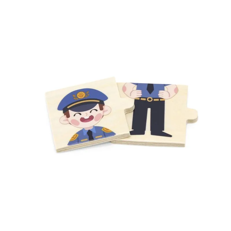 8 koka puzles detaļas, katra sastāv no 3 mīklām.Attēlu motīvi – populāras profesijas, piemēram, ārsts, policists, ugunsdzēsējs un citi.Bērniem būs iespēja paplašināt dažādu profesiju zināšanas, iegūt spēju atpazīt un saskaņot elementus. Šī rotaļlieta arī palīdz attīstīt koncentrēšanās spējas, analītiskās prasmes un radošumu. Viss ir izgatavots no dižskābarža koka un krāsots ar netoksiskām krāsām, kas piesaistīs uzmanību un veicinās jautrību, vienlaikus sniedzot daudz prieka. Krāsas ir 100% drošas, atbilst EN71 un ASTM drošības standartiem.Puzles ir iepakotas krāsainā kartona kastē, lieliski piemērotas dāvanai.Rotaļlieta paredzēta bērniem no 18 mēnešu vecuma.Iepakojuma izmērs:Garums: 206 mm x A: 46 mm x P: 194 mm