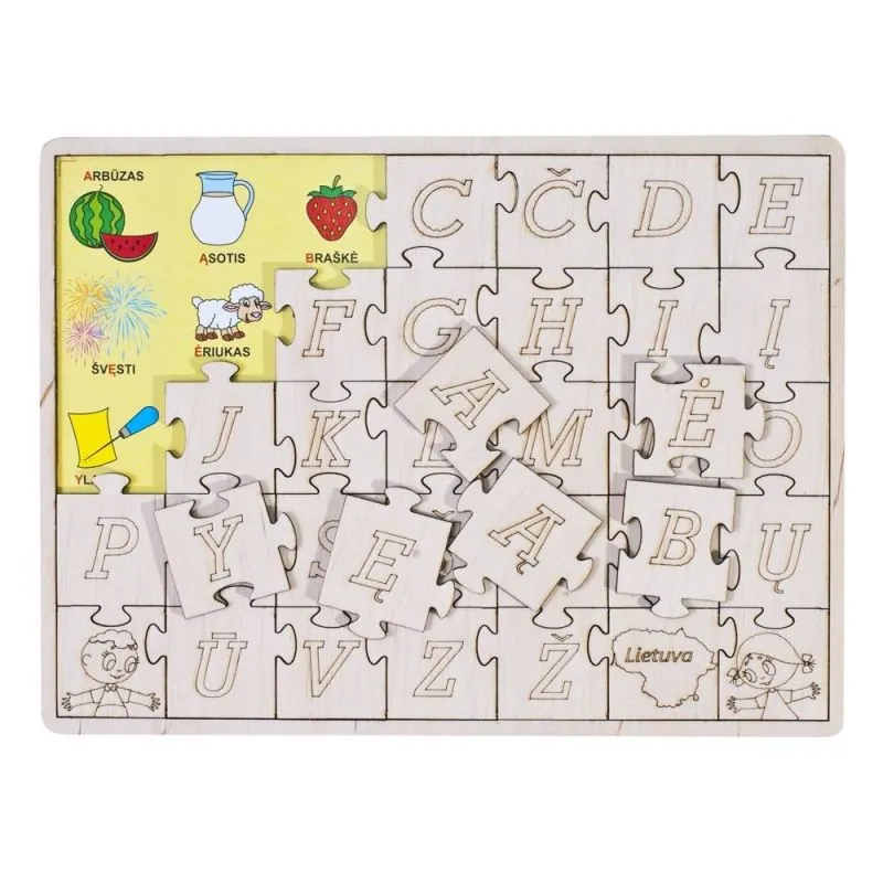 Koka alfabēts – tas ir izturīgs un ilgmūžīgs rotaļlieta. Koka puzle ne tikai ļaus ātri un jautri apgūt visu lietuviešu alfabētu, bet arī attīstīs smalko motoriku un atmiņu. Spēlējot mācīties ir vieglāk. Paredzēts bērniem vecākiem par 3 gadiem.