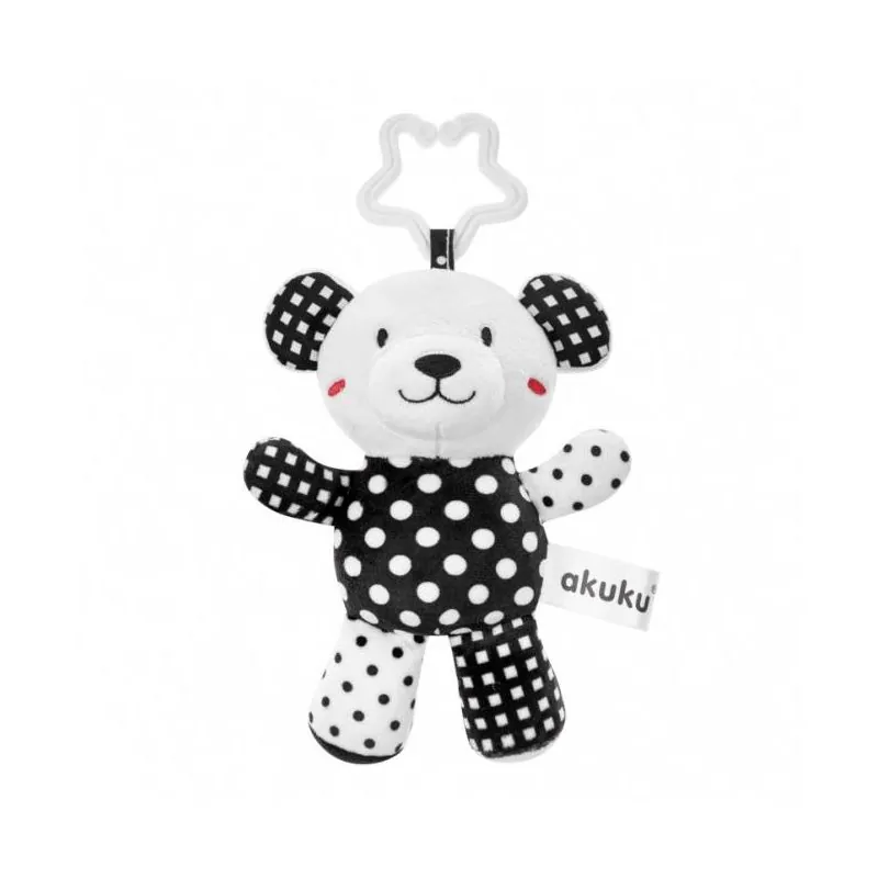 Pūkains piekariņš ir aprīkots ar universālu, viegli piestiprināmu plastmasas rokturi, tāpēc to var piestiprināt jebkur mājās un ceļojumā.Melnbaltās krāsas attīsta redzi, jo zīdaiņi vēl neatšķir krāsas. Pateicoties rotaļlietai, bērns attīsta dzirdi un motorikas koordināciju.
