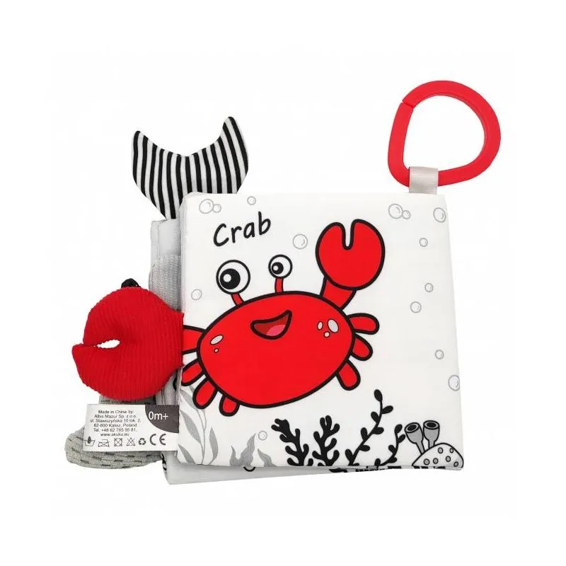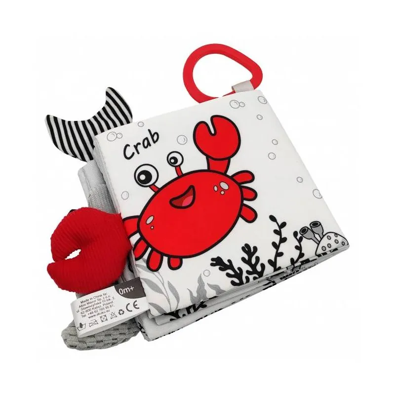 Jūras dzīvnieku sajūtu grāmatiņa ir lieliska rotaļlieta pašiem mazākajiem bērniem, kuri tikai sāk izpētīt pasauli.Tajā ir daudz pārsteigumu, kas ieinteresēs jūsu mazuli.Dažādas tekstūras un īpašības, piemēram, čīkstēšana, grabēšana, čaukstoši elementi un daudzi ieliktņi, stimulēs taustes sajūtu, kas ietekmē jūsu bērna pareizu un harmonisku attīstību.Speciāli izmantotās krāsas mazulim redzamas jau no dzimšanas, un rotaļlieta atbalsta mazuļa redzes, dzirdes un motoriskās koordinācijas attīstību.Praktisks āķis ļauj to piestiprināt pie ratiņiem vai gultiņas.Pateicoties smalkajam un patīkamajam materiālam, tas ir lieliski piemērots, lai mācītos satvert un atklāt interesantas skaņas un formas.