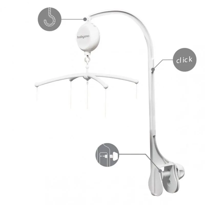 Pateicoties karuseļa funkcijām, aizmigšana kļūst par īstu baudījumu, kad virs galvas parādās mīļi rotaļlietas un fonā skan šūpuļdziesma.Pateicoties universālajam turētājam, karuseli var uzstādīt gan uz tūristu, gan uz koka gultiņas.Karuselis ļauj novērot vienmērīgu objektu kustību.Elektriskais mehānisms ļauj nepārtraukti klausīties un kontrolēt skaļumu.Četras funkcionālās pogas: ieslēgšana/izslēgšana, celiņu pārslēgšana un skaļuma kontrole.„Click“ dizainu ir viegli salikt un izjaukt.Baltais troksnis, kas ir visu frekvenču spektra skaņu kombinācija, var maskēt citus trokšņus.Tam ir nomierinoša iedarbība un tas var veicināt vieglāku aizmigšanu.Četras dabas skaņas: putnu dziedāšana, sirdspuksti, lietus un jūras viļņi – palīdz atslābināties.Mehānisms ietver 19 klasiskās šūpuļdziesmas.Nomierinošās melodijas ļaus jūsu mazulim aizmigt patīkamāk.Karuselis ir izgatavots no augstas kvalitātes materiāliem, pievēršot uzmanību katrai detaļai.Karuselis atbilst Eiropas Savienībā spēkā esošajiem drošības standartiem.