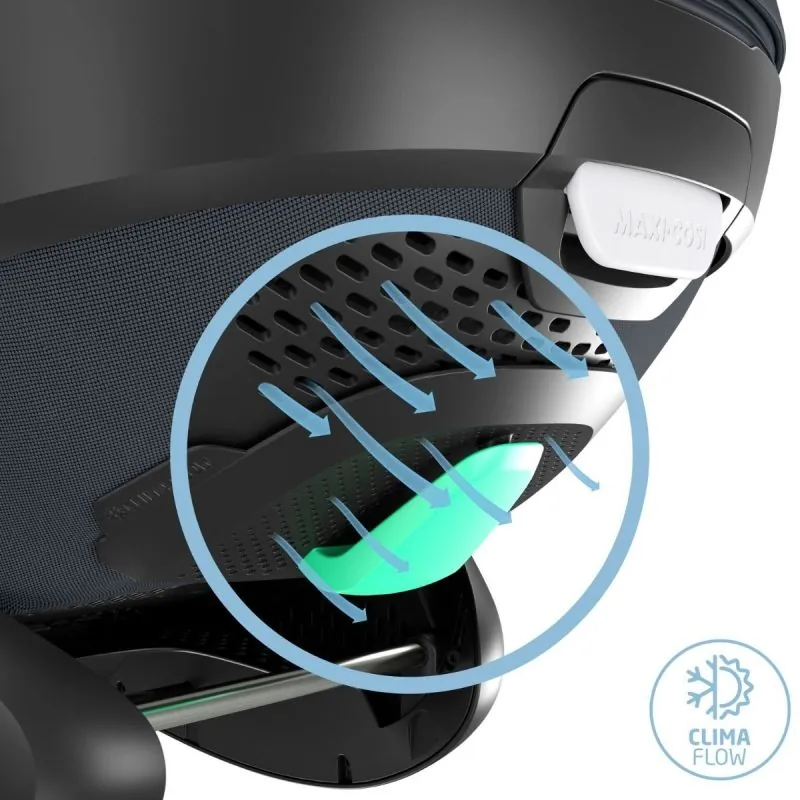Maxi cosi automašīnas sēdeklis ar pilnībā guļošu pozīciju un ventilācijas sistēmu, piemērots no pirmajām mazuļa dienām.