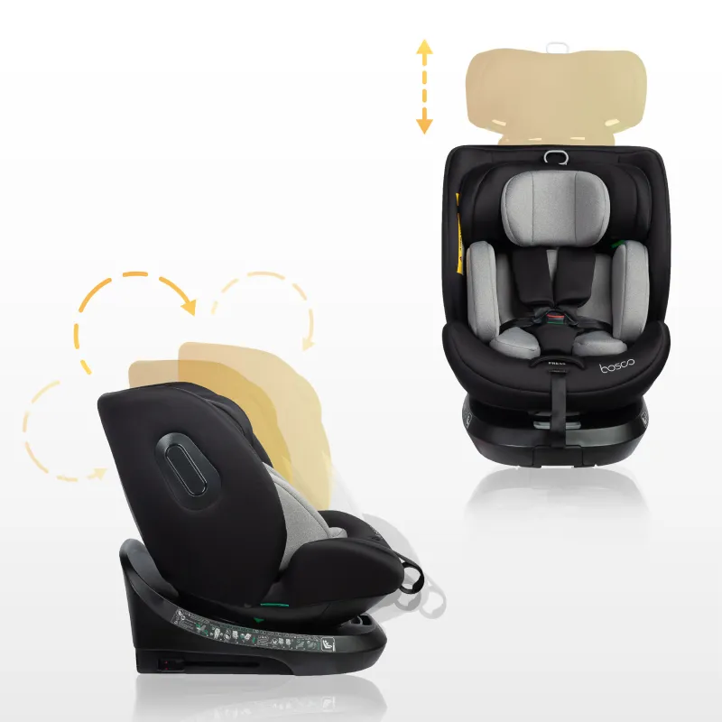 Automašīnas sēdeklis, kas griežas 360 grādos. Paredzēts bērniem no 40 līdz 150 cm. I-size standarts.