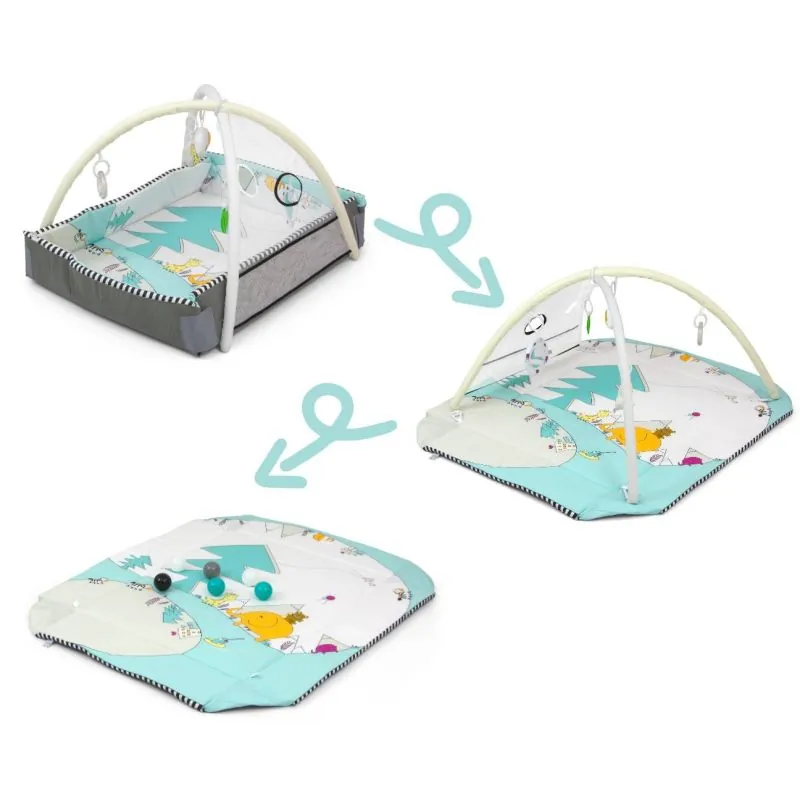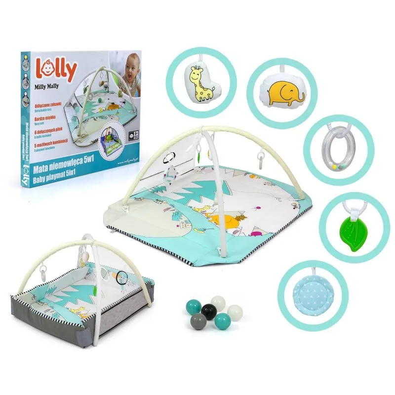 Spilgtas, kontrastējošas krāsas attīsta jaunā pētnieka redzes prasmes un stimulē iztēli.Izglītojošs un sensorisks paklājiņš Lolly 5in1 ir paredzēts bērniem no pirmajām dzīves dienām.Ērts mazajiem, pateicoties pastiprinātajai apakšai, kas lieliski izolē no aukstuma.Komplektā ir divi rotaļu loki, kurus var brīvi pakarināt, bet arī noņemt un spēlēties atsevišķi, 6 krāsainas bumbiņas un 5 izglītojošas rotaļlietas.Lolly paklājiņš apvieno 5 funkcijas:Izglītojošs paklājiņš: salocītas malas, ideāli piemērotas mazākajiem bērniem, nodrošina drošu vietu spēlēšanai vai gulēšanai.Loki tiek piestiprināti pie paklājiņa ārpuses, izmantojot papildu āķus, kas atrodas paklājiņa apakšā.Mācību paklājiņš: salocītas malas un galvas spilvens - lieliski piemērots zīdaiņiem, kuri jau sāk rāpot;Mācību paklājiņš ar 3 salocītām malām: lieliski piemērots zīdaiņiem, kuri kļūst arvien aktīvāki.Paklājiņš bez malām: kā telpa pašiem mazākajiem bērniem, kā droša un silta telpa gulēšanai un spēlēšanai. Iespēja piestiprināt rotaļlietas pie rokturiem paklājiņa iekšpusē.Segas - paklājiņš: nav vecuma ierobežojumu - kā spēlēt, gulēt un atpūsties. Iespēja piestiprināt rotaļlietas pie paklājiņa iekšpusē esošajiem rokturiem.Turklāt tīklā ar kabatu bumbiņām ir divi caurumi, caur kuriem var mest bumbiņas.Paklājiņā ir 5 interesantas rotaļlietas.Plīša rotaļlietas stimulē taustes, dzirdes un redzes sajūtas.Ērts apaļš grabulis slēpj krāsainas bumbiņas, kas interesēs katru bērnu, un drošs spogulis stimulē redzes sajūtu.Paklājiņa pārvalks izgatavots no poliestera - augšdaļa ir patīkama un mīksta pieskārienam.Apakša izgatavota no izturīga poliestera, kura tekstūra nodrošina stabilitāti uz dažādām virsmām.Paklājiņa iekšpuse ir piepildīta ar 2 cm putuplastu, kas nodrošina mīkstumu un lieliski izolē no aukstām grīdām.Rotaļlietas un paklājiņu var notīrīt ar mitru drānu.Lielāku netīrumu gadījumā paklājiņu var mazgāt ar rokām.Ieteicamais vecums 0+.Materiāls: poliesters, Hipoalerģisks.