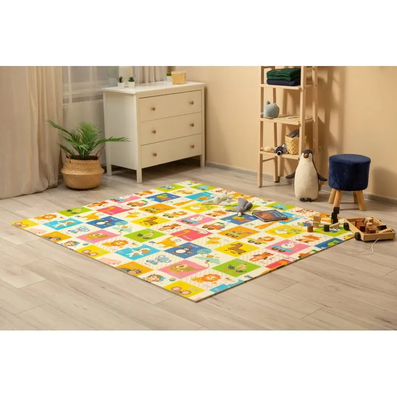 2 unikāli izdrukas katrā pusē.Mīkstas un izturīgas putas nesaburzās, tāpēc paklājiņš kalpo ilgi.Liela spēļu laukums 180x200 cm.Piemērots bērniem no pirmajām dzīves dienām.Nelielā iespaida dēļ paklājiņš ir neslīdošs un pozitīvi ietekmē bērna sensorisko attīstību.1 cm biezums nodrošina pietiekamu izolāciju no grīdas, un ūdensizturīgā konstrukcija ļauj to izmantot pat ārā.Drošs alerģiskiem cilvēkiem - neuzsūc mitrumu un smakas.Bez kaitīgām vielām: PVC, ftalātiem, formamīda, fenoliem un formaldehīda.Izglītojošais paklājiņš Toyz ir ne tikai droša spēļu telpa bērnam, bet arī lielisks veids, kā pavadīt laiku kopā ar vecākiem.Divi unikāli nospiedumi abās pusēs.Lieliski piemērots formu, dzīvnieku un krāsu apguvei.Soma ar rokturi ļauj ērti uzglabāt un transportēt paklājiņu.Viegla tīrīšana – vienkārši noslaukiet ar mitru drānu.