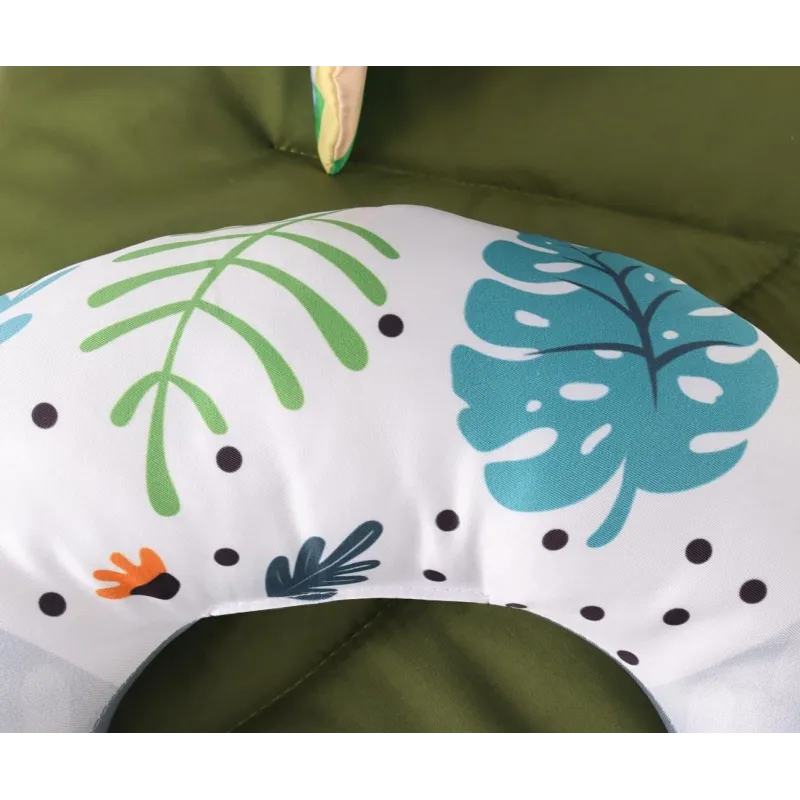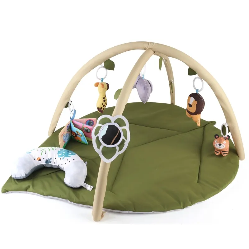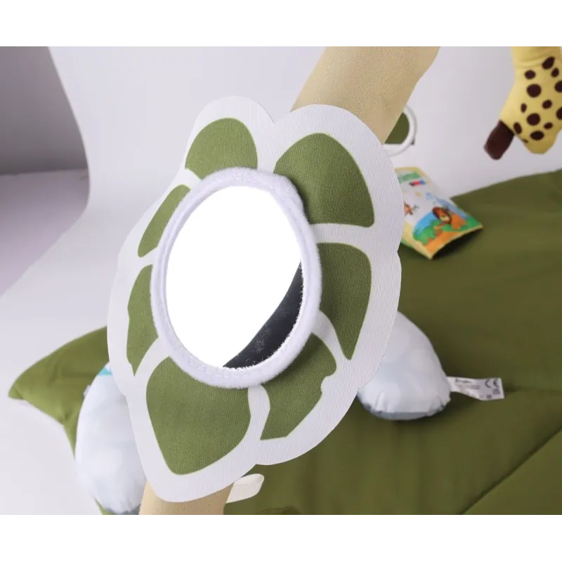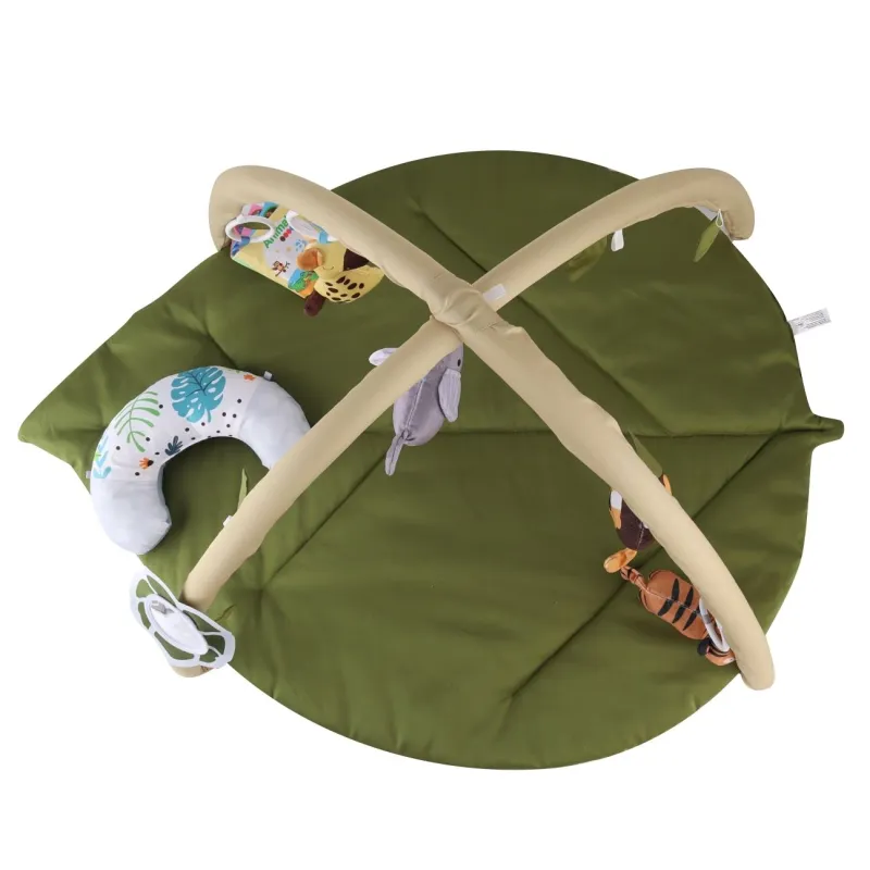 1 mīksts lapas formas paklājiņš;2 arkas ar lapu dekorācijām;1 drošs zieda formas spogulis;1 sensorā grāmata ar krāsainām dzīvnieku ilustrācijām;1 pusmēness formas spilvens;4 piekariņi – plīša rotaļlietas (lauva, tīģeris, žirafe, zilonis);6 piekariņu turētāji;Augstas kvalitātes ražošana – mīksti audumi, draudzīgi jutīgai mazuļa ādai;Krāsas un tekstūras – stimulē mazuļa sajūtas: redzi, dzirdi un tausti;Interaktīvās rotaļlietas – katra plīša rotaļlieta veic atšķirīgu funkciju: grabuli, pīkstuli vai čaukstēšanu;Mīksts pildījums – nodrošina izolāciju no aukstuma un komfortu;Piemērots: no 0 mēnešiem;Paklājiņa izmēri: 112 cm (diametrs – platākā vieta);Augstums no paklājiņa līdz arkas augšai: 52 cm.