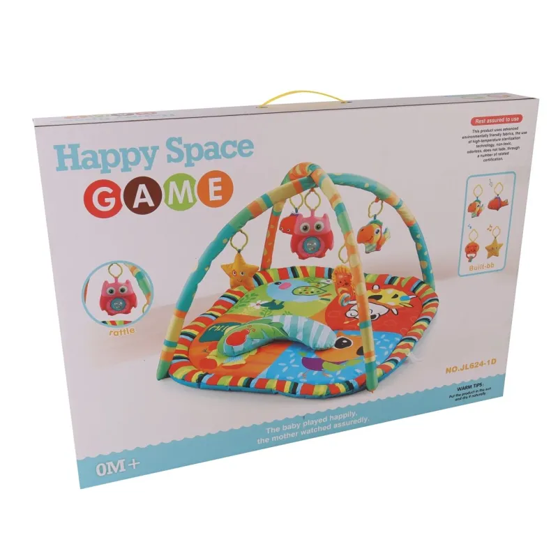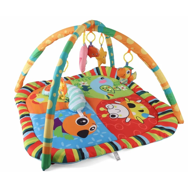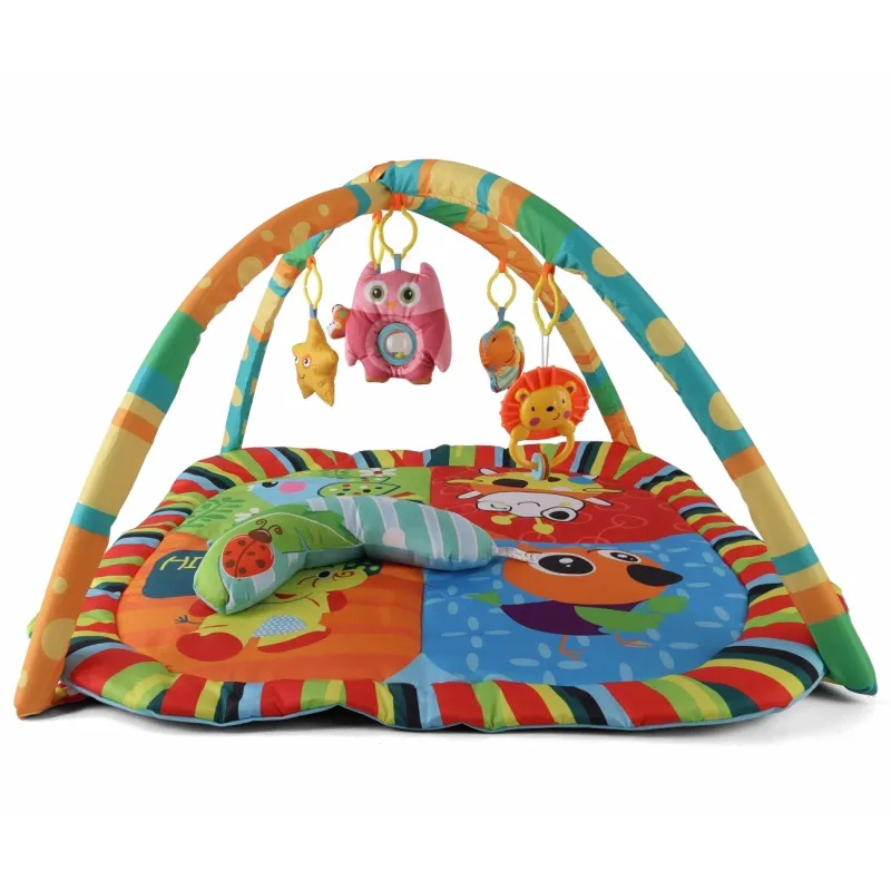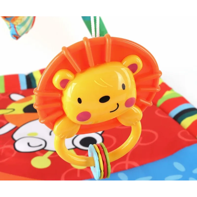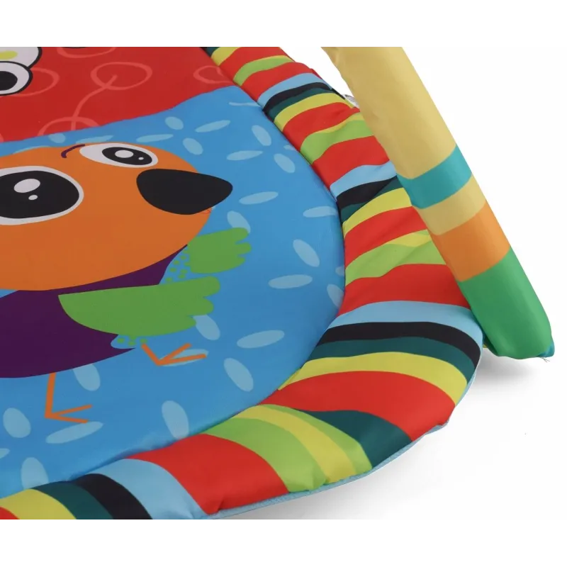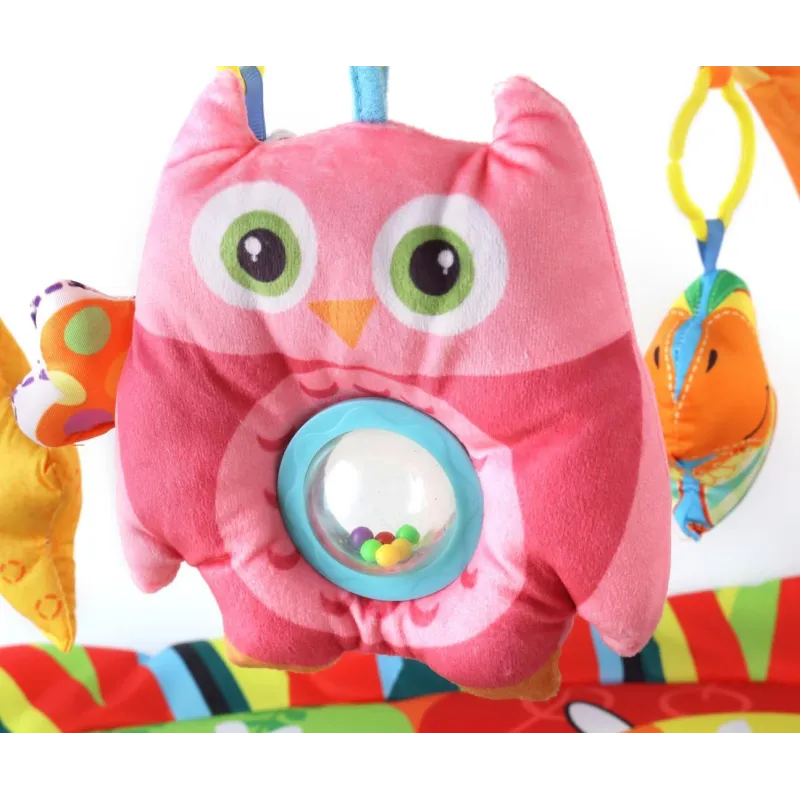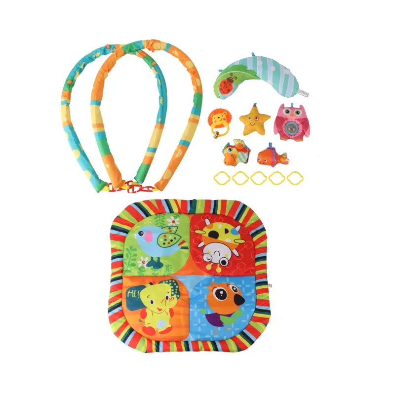 2 krāsainas, noņemamas arkas;5 attīstošie piekariņi: mīksta pūce ar grabuli, zvaigzne ar izšūtām acīm, dzīvnieki ar pīkstieniem un skaņām, kā arī plastmasas lauvas grabulis;1 mīksts spilvens ar mārītes motīvu;4 dzelteni rotaļlietu turētāji;Rotaļlietas var brīvi pārvietot uz citu vietu vai izmantot atsevišķi. Katram no tiem ir sensorie elementi: skaņas, dažādas tekstūras, drošas krāsas un kustīgas daļas;Mīksts un patīkams pieskarties paklājiņa virsma;Izteiksmīgi dzīvnieku raksti piesaista mazuļa uzmanību;Veicina motorikas un sensorikas attīstību;Vecums: 0+ mēneši;Paklājiņa izmēri: 85x75 cm.