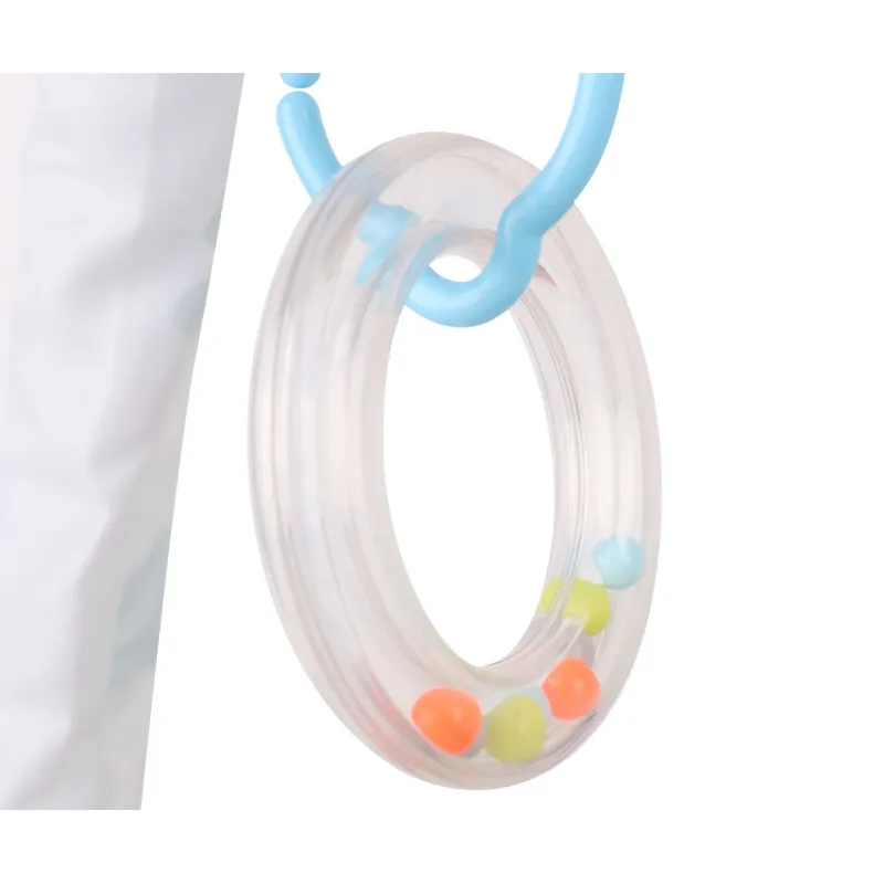 4 mīkstas rotaļlietas un grabuļi: plīša zilonis, dzeltena pīle, caurspīdīgs grabulis ar bumbiņām, graužamriņķis un 1 sensorais gredzens;