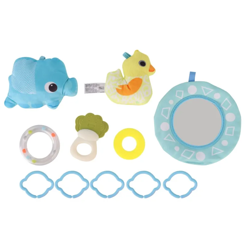 4 mīkstas rotaļlietas un grabuļi: plīša zilonis, dzeltena pīle, caurspīdīgs grabulis ar bumbiņām, graužamriņķis un 1 sensorais gredzens;