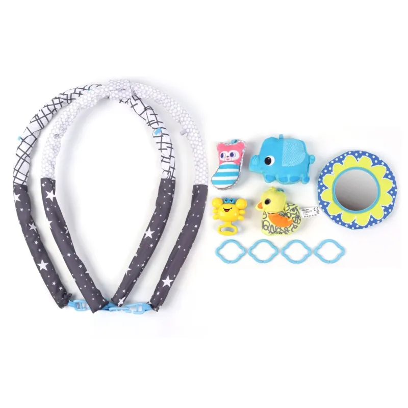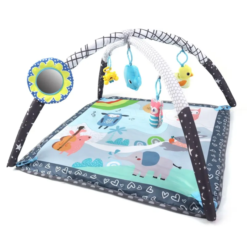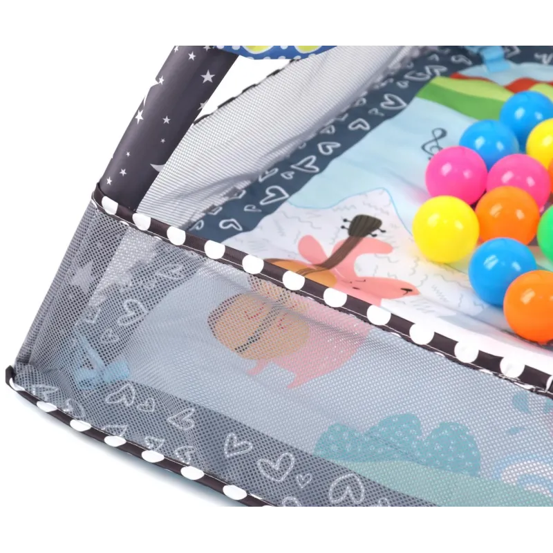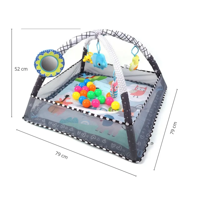 2 krāsainas, noņemamas arkas;3 mīkstas rotaļlietas un grabulis;Drošs spogulītis;3 zilas rotaļlietu turētāji;20 krāsainas bumbiņas (dažādās krāsās);5 plastmasas caurules sienu stiprināšanai;4 zilas rotaļlietu turētāji;Tīklveida sienas – plašas, drošas un elastīgas;Var izmantot kā attīstošo paklājiņu vai bumbiņu baseinu;Rotaļlietas var brīvi pārvietot uz citu vietu vai izmantot atsevišķi. Katrai no tām ir sensorie elementi: skaņas, dažādas tekstūras, drošas krāsas un kustīgas daļas;Mīksts un patīkams pieskārienam paklājiņa virsma;Izteiksmīgi dzīvnieku raksti piesaista mazuļa uzmanību;Veicina motorikas un sensorikas attīstību;Vecums: 0+ mēneši;Paklājiņa izmēri: Augstums: 52 cm, platums: 79 cm, garums: 79 cm.