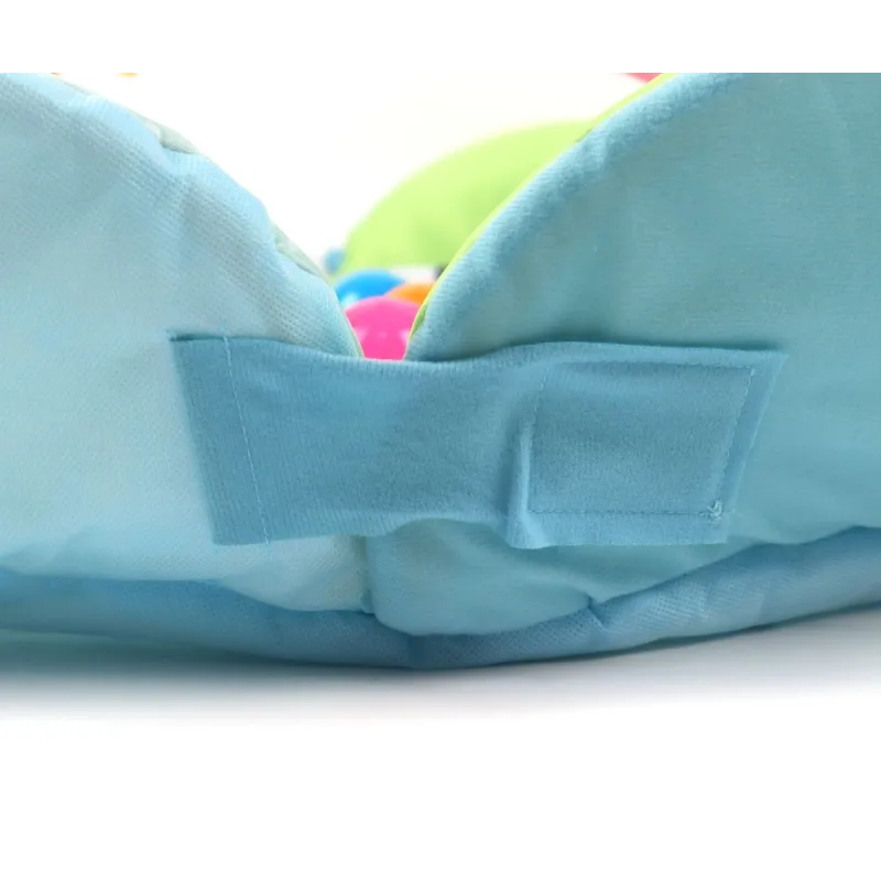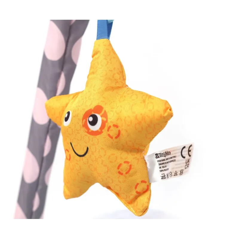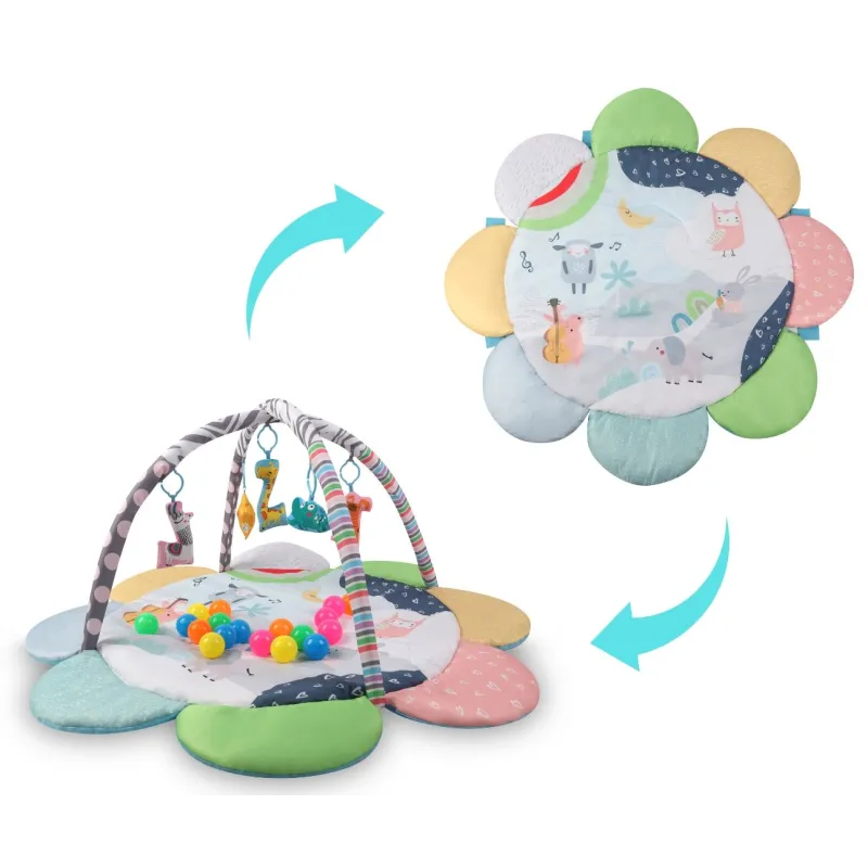 Zieda formas spēļu paklājiņš;2 elastīgas arkas;5 piekarināšanas cilpas ar rokturiem;20 krāsainas bumbiņas;Vecuma grupa: 0 mēn.+Atbilst Eiropas drošības standartiem.